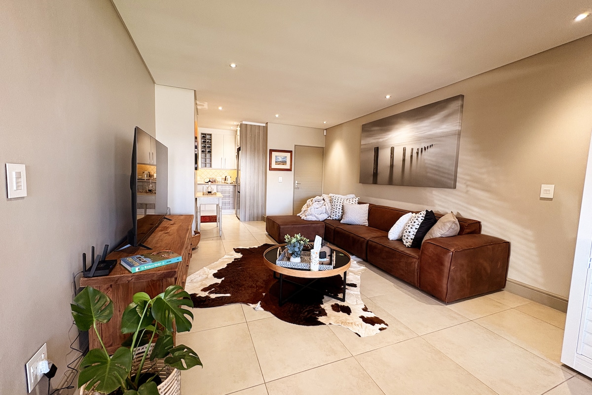 Enjoy a stylish experience at this centrally-located place only 1 km from the beach. It is a peaceful getaway, designed with open-volume living, 2 fairly spacious en-suite bedrooms, a cozy pajama lounge with TV, and a stylish main lounge. The fully equipped kitchen with separate scullery makes self-catering effortless. A north-facing wooden deck, complete with a built-in braai, heated splash pool, and distant sea views. Safe parking in a garage.