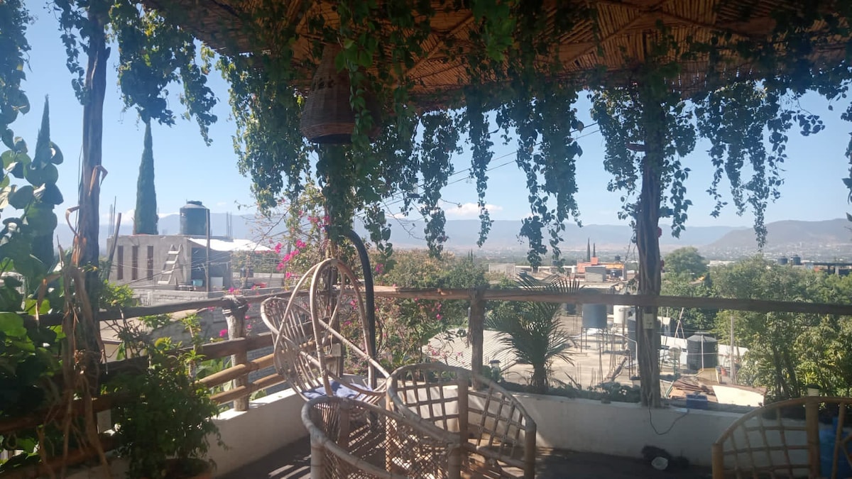 Habitación con baño propio, agua caliente, Wi-Fi, ventilador. Contamos con estacionamiento, y con un área de descanso para disfrutar de la bella vista panorámica de Oaxaca, estamos ubicados en una zona muy tranquila y cómoda ya que cualquier transporte que requiera pasan a una cuadra del área. A 5 min de ex-convento histórico de Cuilapam. A 12 min de Zaachila. A 20 min del centro de Oaxaca. ¡Te esperamos!