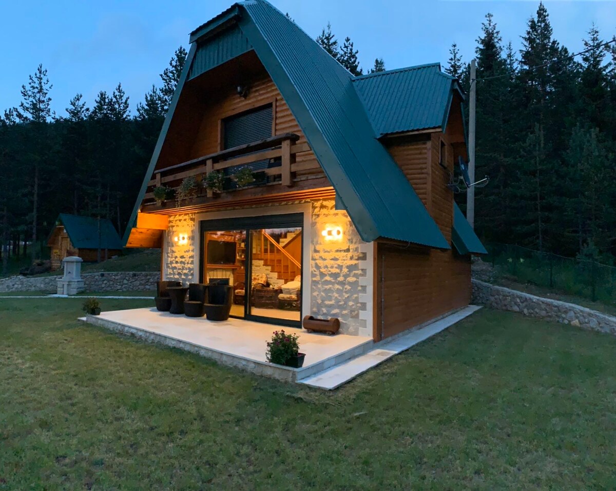 Nestled in pristine nature, this charming, stylishly decorated cottage offers an incredible view of Durmitor Mountain and Riblje Lake. The front is entirely made of glass, providing an unforgettable panoramic experience. Stunning lighting enhances its remarkable appearance. Upstairs, the gallery features a cozy French bed, perfectly positioned to wake up to the breathtaking sight of the mountain. This cottage is the ideal retreat for complete enjoyment of natural beauty and tranquility.