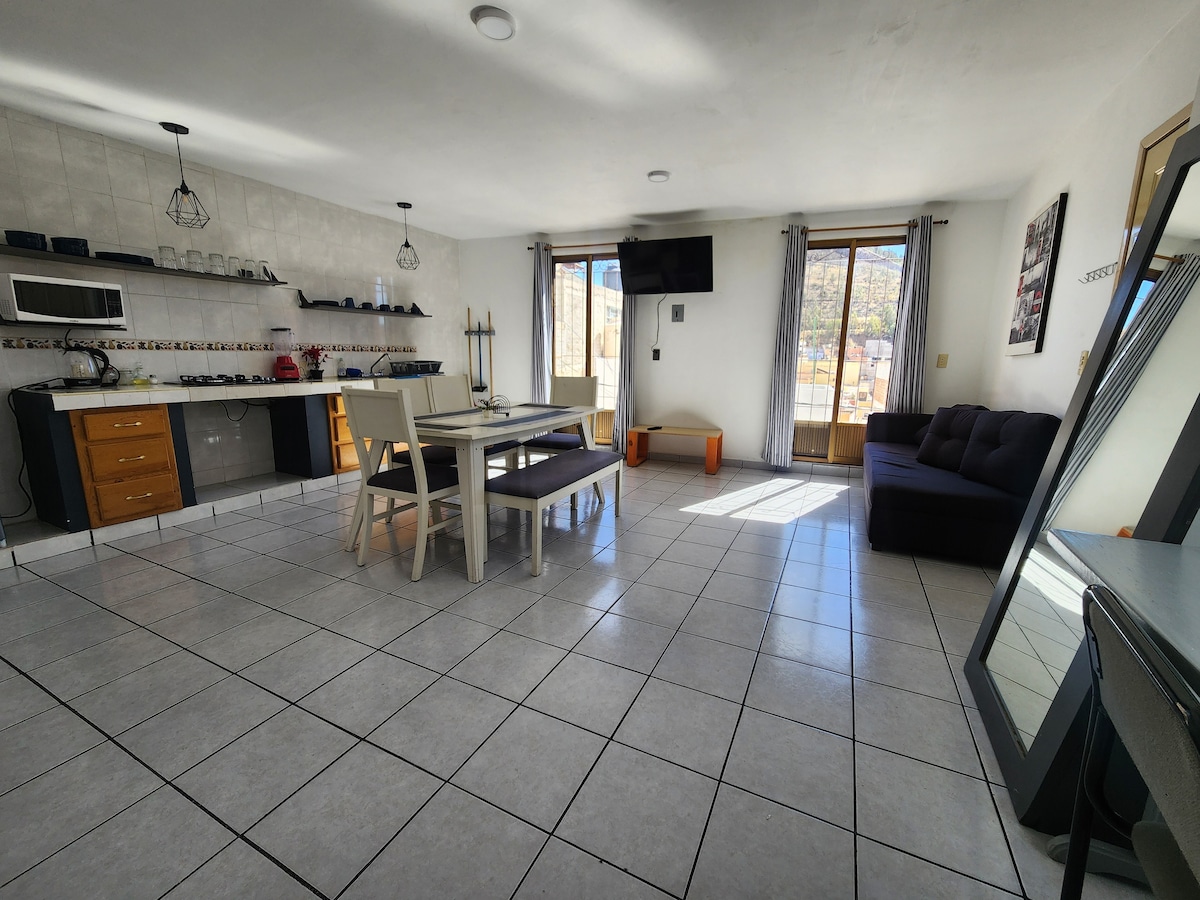 Beautiful apartment a few steps from the heart of Zacatecas. Enjoy an unforgettable stay in this cozy house ideal for families. TERRACE: It is for the exclusive use of guests and the entry of more people or the holding of events is not permitted. PARKING: We do not have a garage, but there is space available on the public road right in front of the house. It is a safe area and is monitored with video surveillance cameras. It is worth mentioning that we have never had incidents.