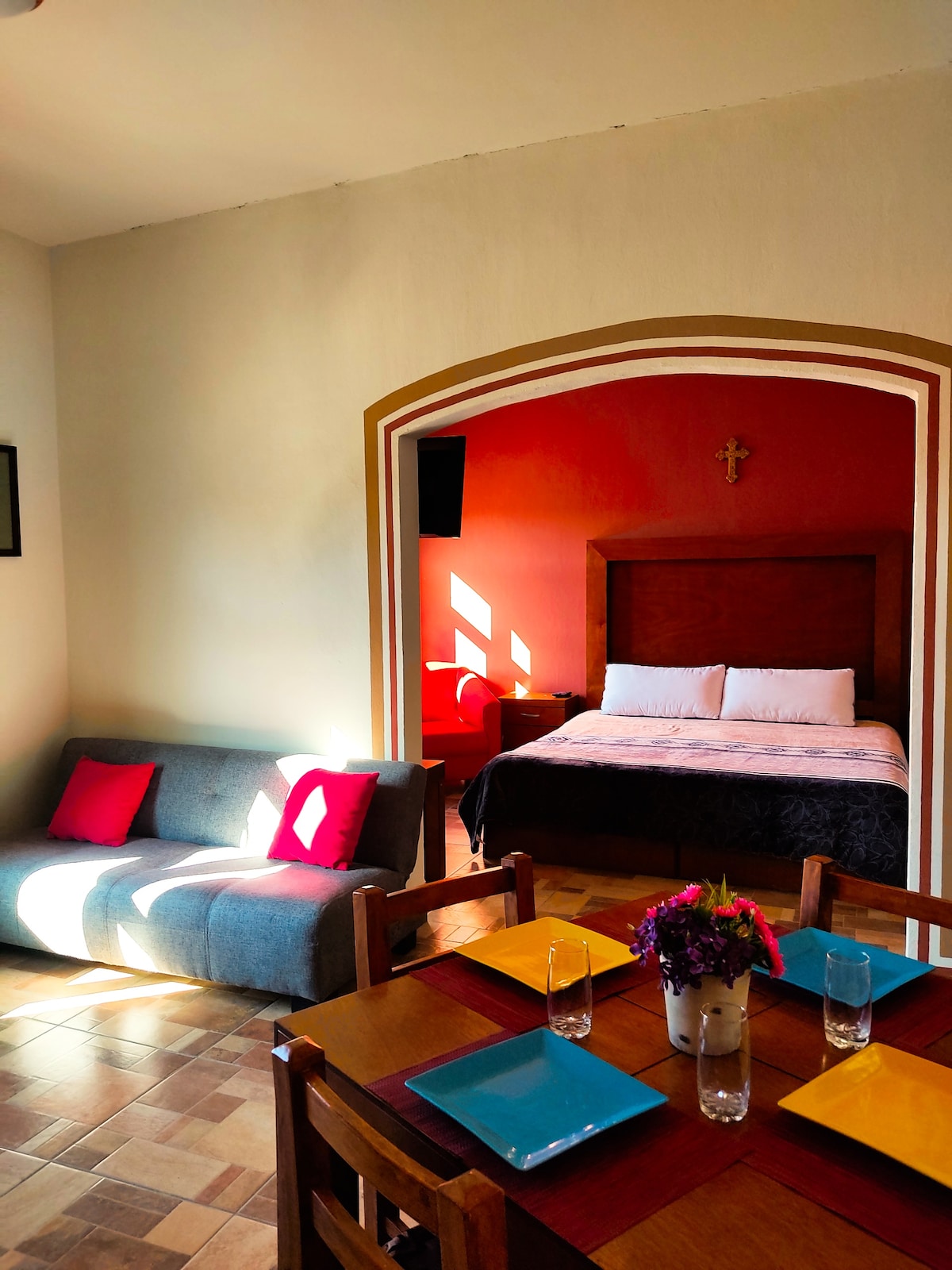 Excelente estancia privada con una recámara, cocina, comedor y sala. Estacionamiento en la acera frente al departamento. Está localizado en el centro de Guadalupe, Zacatecas a 20 minutos en automóvil del centro de la Ciudad de Zacatecas. A sólo 10 minutos de las instalaciones de la feria y monumental Lienza Charro. WI-FI gratis, calentón solar. Lugar tranquilo para descansar.