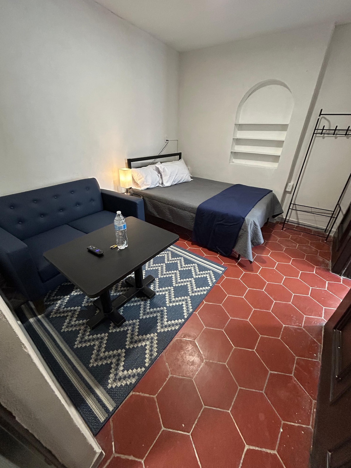 Pequeño Departamento Estudio justo en el centro histórico de Zacatecas El departamento Cuenta con cuarto amplio con: -cama King Size -sofá cama matrimonial -television con cable de 50” - Mesa y 3 sillas WIFI NETFLIX Baño completo : Secadora de cabello toallas Plancha Cocina con: Refrigerador Estufa Horno de microondas Cafetera café azúcar y crema incluidos Cuenta con Balcón con hermosa vista hacia el centro de Zacatecas y la bufa.