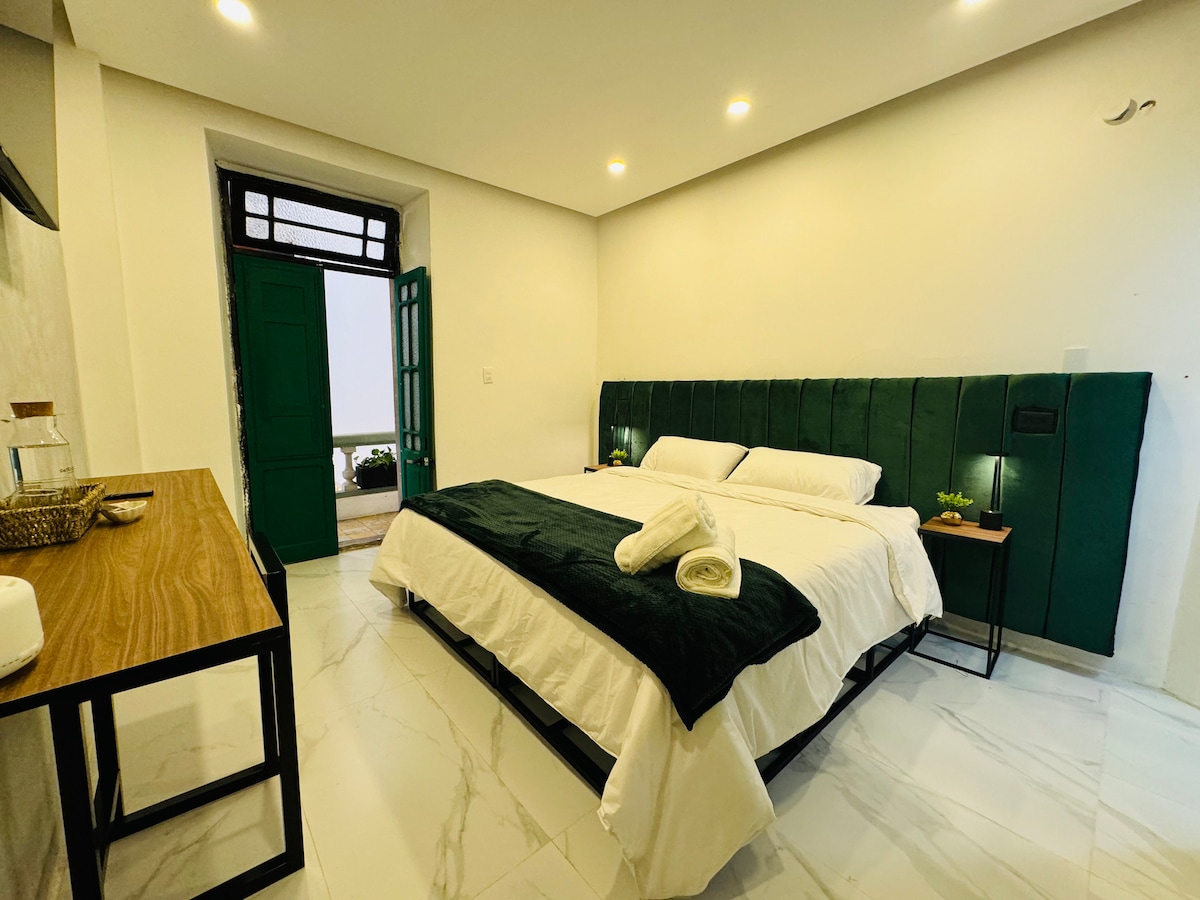 Doble suite, boutique hotel–style, featuring two beds, a sofa bed, and a private parking space in a closed garage. Equipped with hot water, air conditioning, and heating. Centrally located, with a smart TV with Prime Video, minibar, full bathroom, one king-size bed and one full-size bed. You’ll find many great dining options, shops, and laundromats nearby. Walk to the historic downtown area. We are happy to assist with any recommendations you may need around the city.