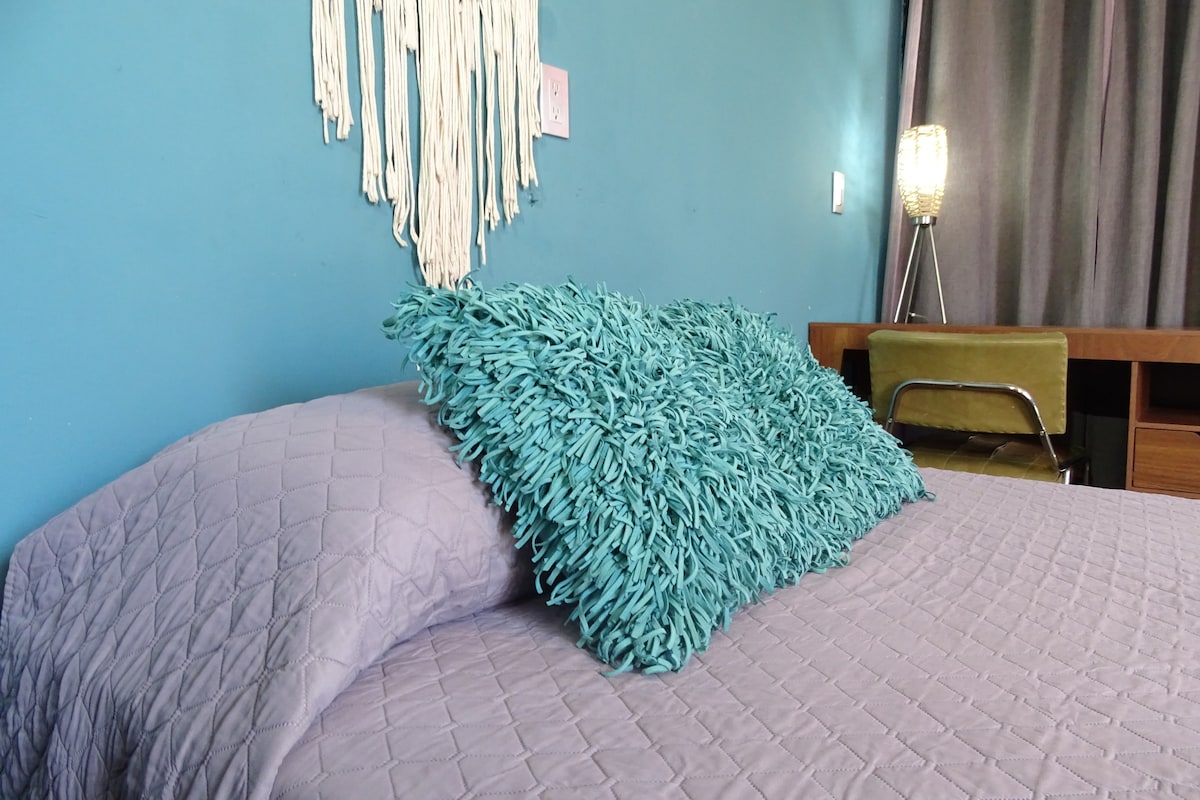 Habitación con cama matrimonial con baño completo privado, cuenta con una cocina pequeña Pero con todo lo necesario para tus necesidades, cuanta con utensilios básicos de cocina, area para fumar, cuenta con entrada independiente. Contamos con estacionamiento sobre la calle, la colonia es muy tranquila y segura, Solo de favor NO estacionarse en la áreas marcadas en color rojo en las fotos, todo lo demás está libre para estacionamientos.