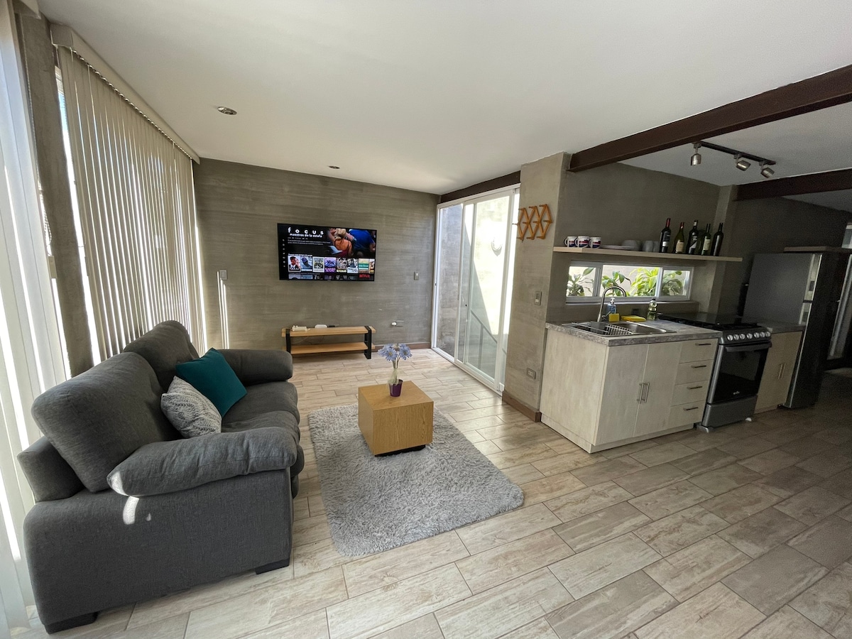 Departamento tipo loft totalmente equipado para gozar de una estadía realmente placentera y como en casa, diseño muy original y acogedor, una amplia terraza para tomar el sol y tener una rica tarde, ubicada cerca de cines, súper,farmacia y tienda de abarrotes frente al departamento, una zona tranquila de la ciudad, el lugar ideal para tener horas de descanso y/o trabajar sin el bullicio de estar en medio de la ciudad.