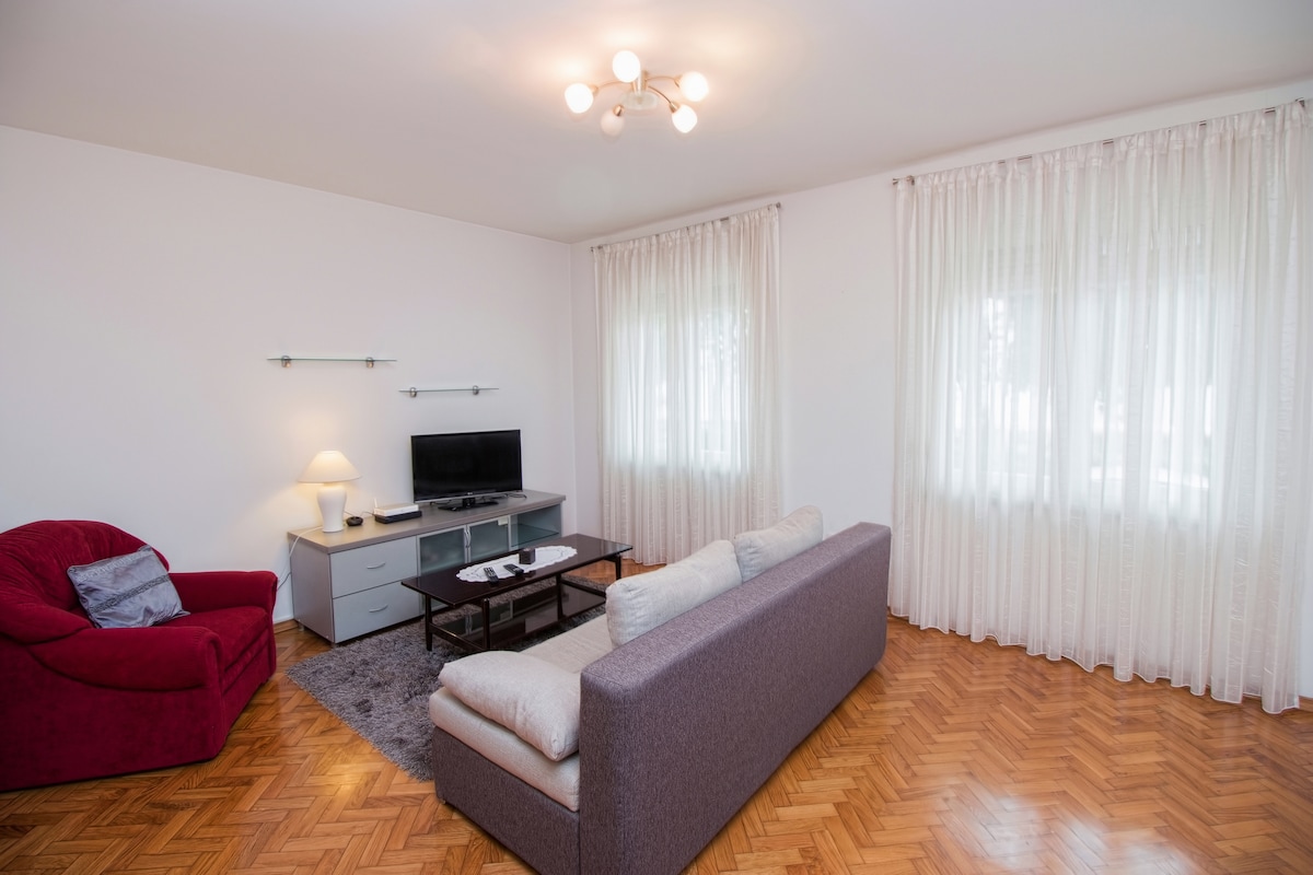 Apartment on the ground floor of a family house with separate entrance and private parking. Just a 10 minute walk from the Center, 2 minutes to the shopping centers, sports grounds and fitness club. 10 minutes walk to City Beach. Apartment is completely new and equipped with all household appliances and hygienic accessories. Towels and bed linen are included in the price. We prepare local specialties, grilled and baked meat and fish in the tavern within the separated facility. Pets on request.