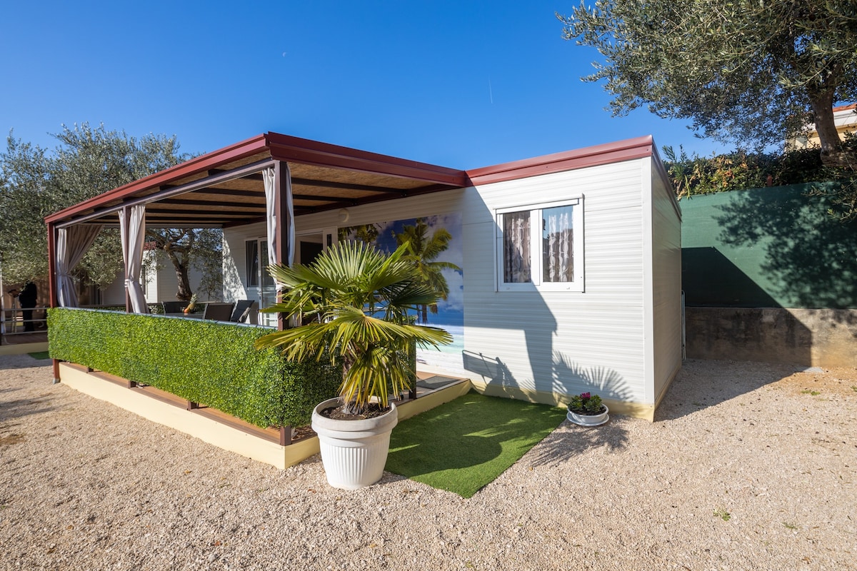 Mobil home with swimming pool located first row by the sea in the town of Tribanj Običaj. Surrounded by beautiful nature, it provides excellent conditions for a vacation in the immediate vicinity of the sea.his unique place has a style all its own.