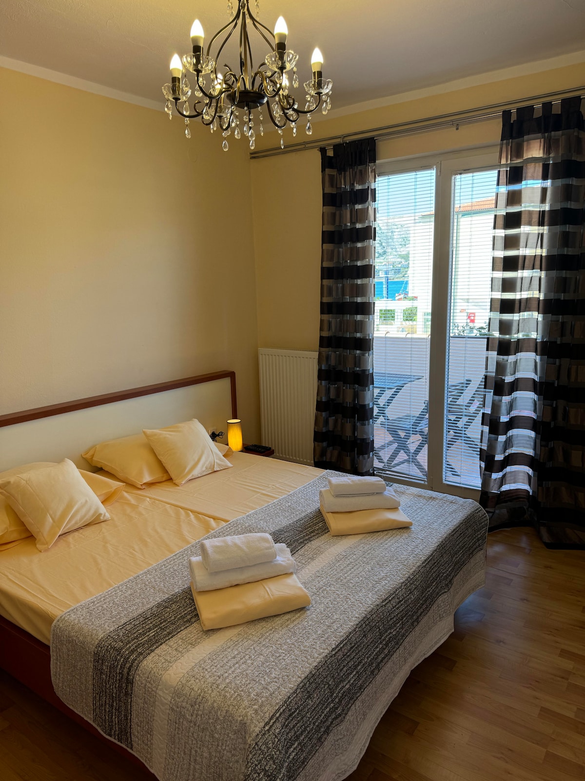 Apartman se nalazi u prizemlju kuće,s pogledom na more.Blizina mora je 20 m .(samo se pređe cesta).Pekara se nalazi na 100m od kuće a prva trgovina i pošta su udaljene 300 m . centar grada je udaljen 1000 m od kuće.Restaurant je ispred kuće te kuća ima privatan parking. Centar grada je pješice 10-ak min. udaljen od app a šetnja do grada je uz predivno more.