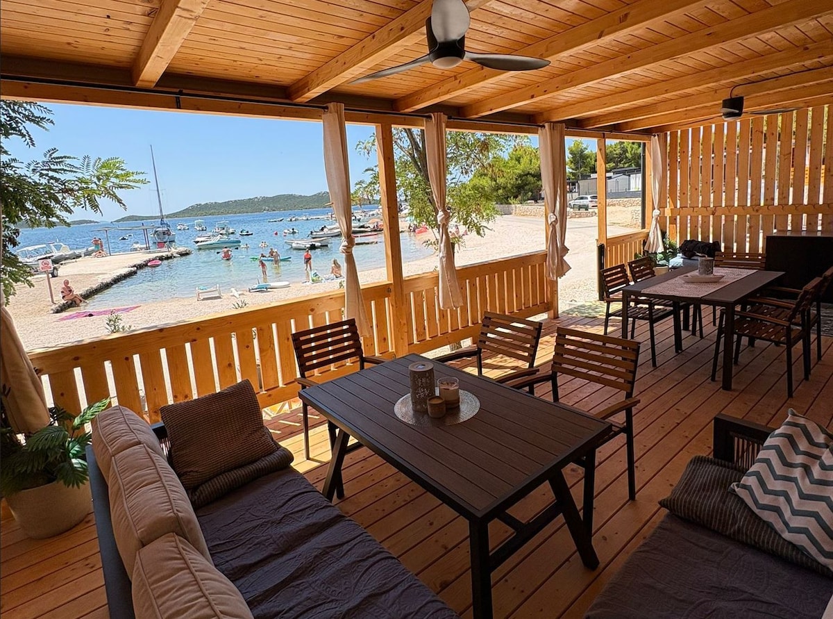 Mobil home with swimming pool located first row by the sea in the town of Tribanj Običaj. Surrounded by beautiful nature, it provides excellent conditions for a vacation in the immediate vicinity of the sea.his unique place has a style all its own.