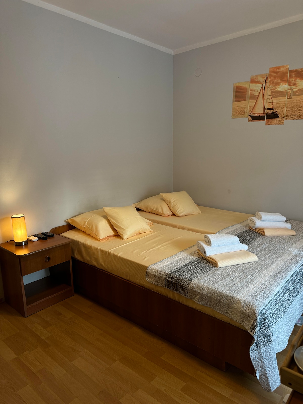 Apartment in Zadar, Croatia - 45m2 for 4 person. Near Center and sand beach(2800m). Free covered parking, usage of grill and garden. Air condicioned. Restaurant 30, market-350 m near. Shopping centers-1000 m. Possible to organize trips with sailing boat.