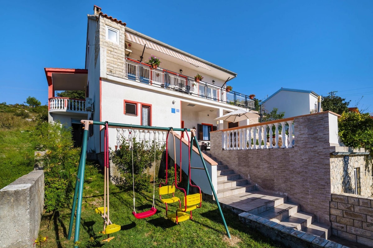 Two-storey apartment (A4) 85m2. It's nice and newly decorated, close to the beach and town center. The ground floor consists of a kitchen, living room, dining room and bathroom. From the ground floor is a terrace (20m2) with an unforgettable view of the sea. Upstairs there are two bedrooms that have balconies. Guests have parking in the yard, fireplace for barbecue and outdoor shower. The house is surrounded by olive trees and mediterranean flowers.
