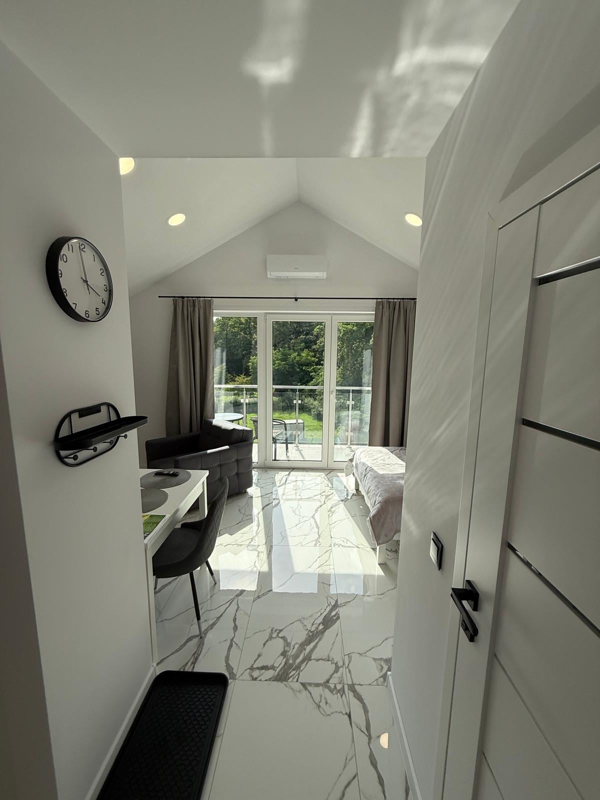 Duży, przestrzenny pokój z łazienką, z tarasowym wyjściem na leśny ogród, wyposażony w wygodną, rozkładaną do spania, dwuosobową sofę. Dodatkowe miejsce do spania, komfortowe dla dwóch osób, znajduje się na półotwartej na zewnątrz antresoli, zabezpieczonej moskitierą - do użytku w ciepłych miesiącach roku. W pokoju stylowy piecyk, wygodny stół, szafa i duża komoda. Do dyspozycji gości, znajdująca się obok, w pełni wyposażona kuchnia. Istnieje możliwość rozpalenia ogniska i zrobienia grilla.