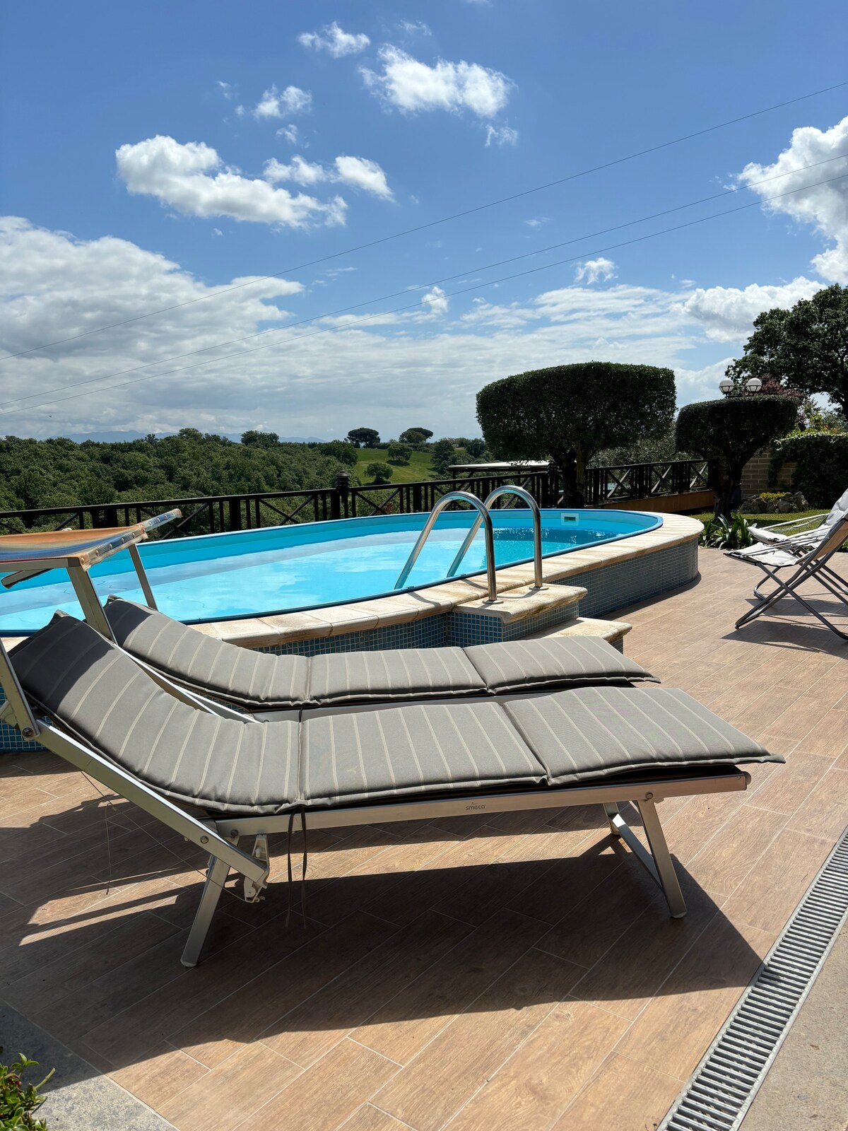 Surrounded by nature, 10 minutes away there is a direct connection to the Vatican and the historic center. Available free of charge under the house: a seasonal swimming pool with sun loungers and umbrellas included a private guarded parking inside the property a large garden with relaxation area. The large park surrounding the house guarantees a stay of tranquility and well-being, without the noise of Roman traffic.