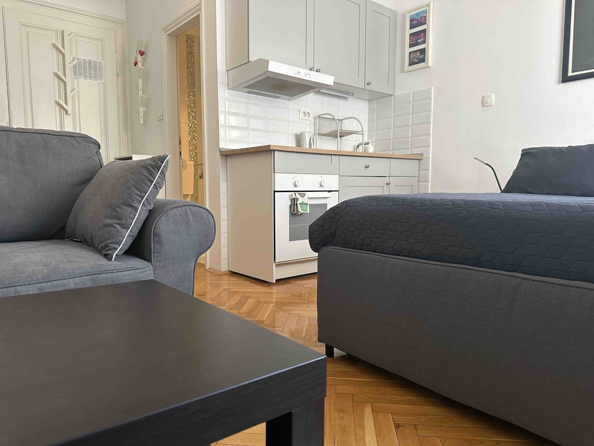 Step through the white door from a secret garden of a 19th century building, and enter a modern apartment. Right in the heart of Zagreb! Sun streams in through tall windows to illuminate beautifully refurbished parquet floors and high ceilings. This private and tranquil apartment in the old city center has been thoroughly modernized with every convenience for a comfortable stay.