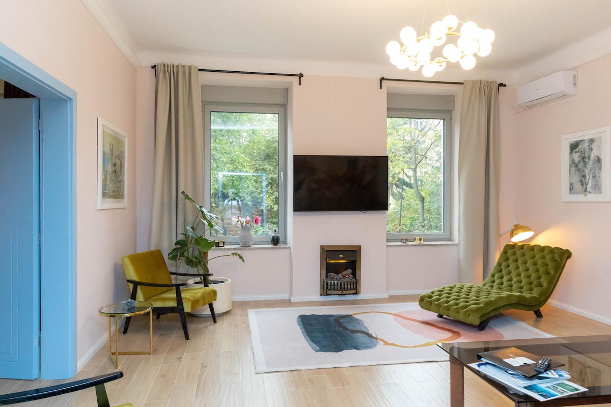 Fully furnished and equipped apartment with high ceilings that combine historical elements with modern décor can comfortably accommodate 3 guests and a child. There is one king size bed, one foldout bed and a crib. The place consists of spacious living room, kitchen and dining area, very large bedroom with king size bed and plenty of closet space and a bathroom with a shower. The place is very quiet with fresh garden air so you can leave your windows open on warm days and nights which is a rare find in city centre.