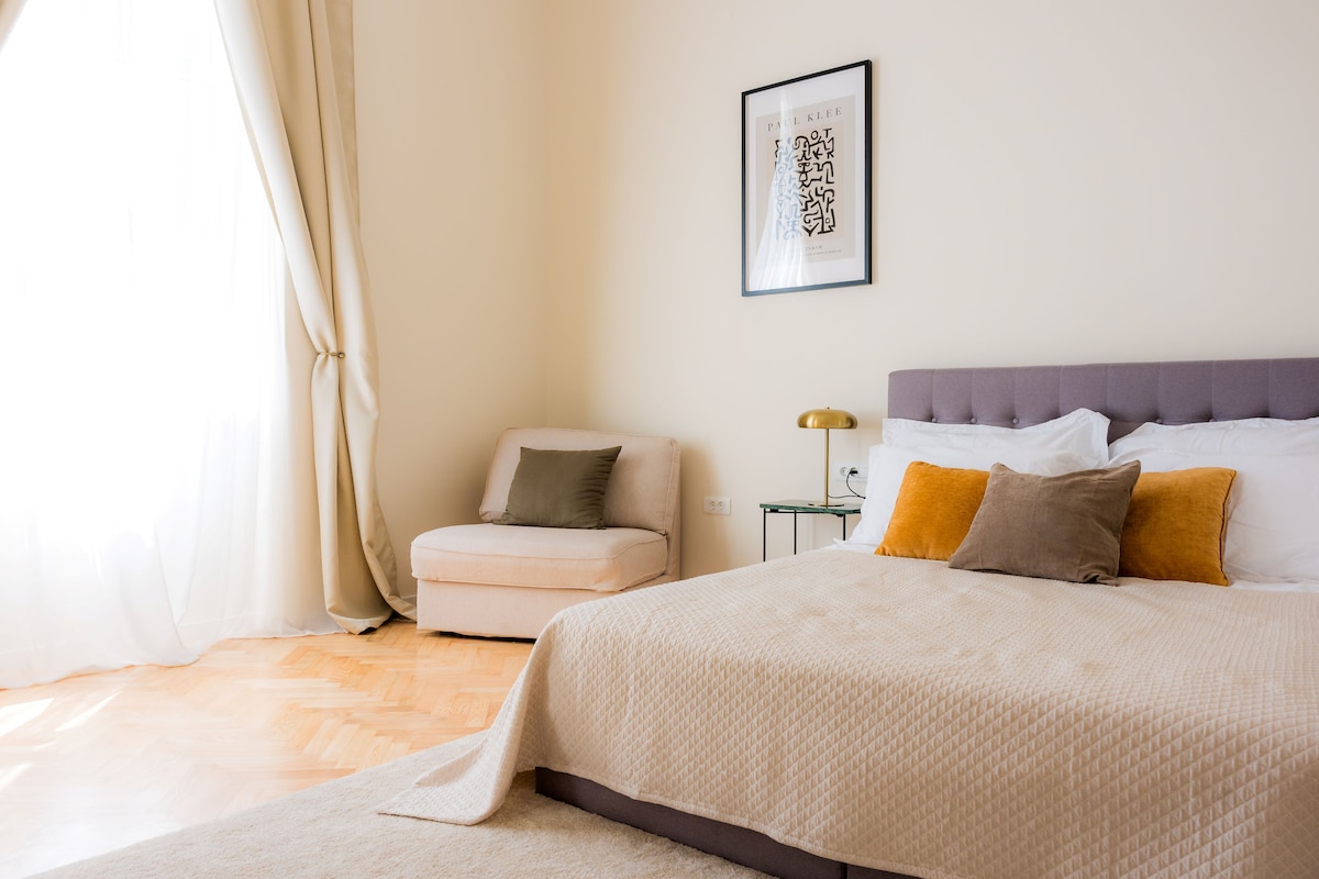 Step through the white door from a secret garden of a 19th century building, and enter a modern apartment. Right in the heart of Zagreb! Sun streams in through tall windows to illuminate beautifully refurbished parquet floors and high ceilings. This private and tranquil apartment in the old city center has been thoroughly modernized with every convenience for a comfortable stay.