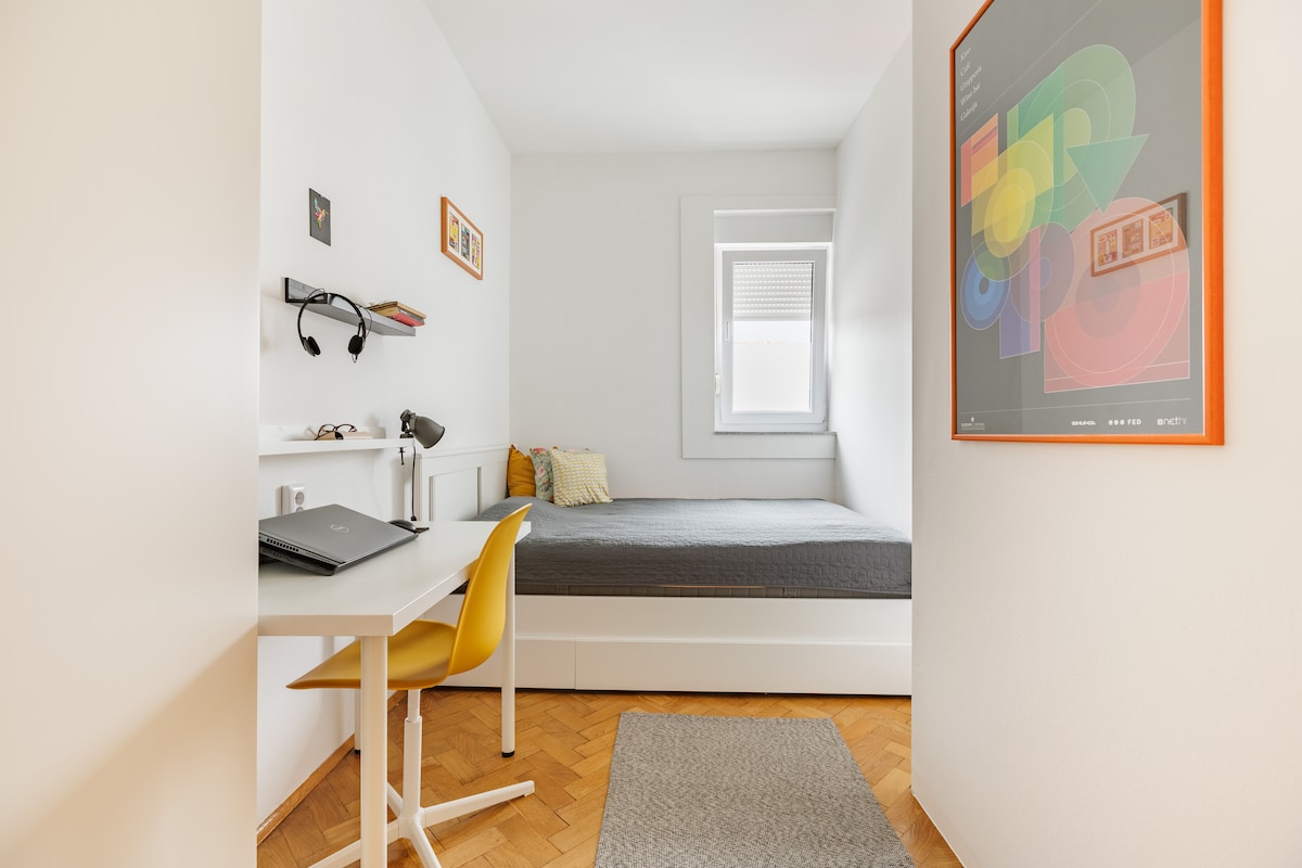 Studio / Soba 42 idealan je odabir za kraći boravak u Zagrebu za 1 ili 2 osobe. Studio se nalazi u visokom prizemlju, ima ukupno 20 m2 I sastoji se od glavne prostorije opremljene krevetom (za 1 ili 2 osobe, veličine 150cm x 200 cm), radnim stolom i 2 stolice, ormarom, smart tv-om, malom kuhinjom, te kupaonice i balkona. Prostor je novouređen, te gost dijeli ulaz u stan s vlasnikom stana.