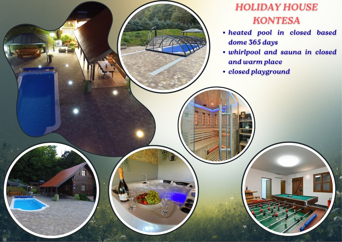 Drvena tradicionalna kuća 90m2 s velikim privatnim bazenom, smješteno pored šume na imanju od 12.000m2, dvije kupaonice, spavaća soba s bračnim krevetom + dječji krevetić, soba u potkrovlju s 2 kreveta + bračni krevet, dnevna soba s trosjedom, terasa s pogledom na bazen (400m2). Roštilj i mnoštvo sadržaja za djecu i odrasle. Smještena u parku prirode s nebrojenim prirodnim i rukom izrađenim ljepotama. Lijepo i mirno, idealno za obitelji s djecom, ljude u "zlatnoj dobi" i ljubitelje umjetnosti.