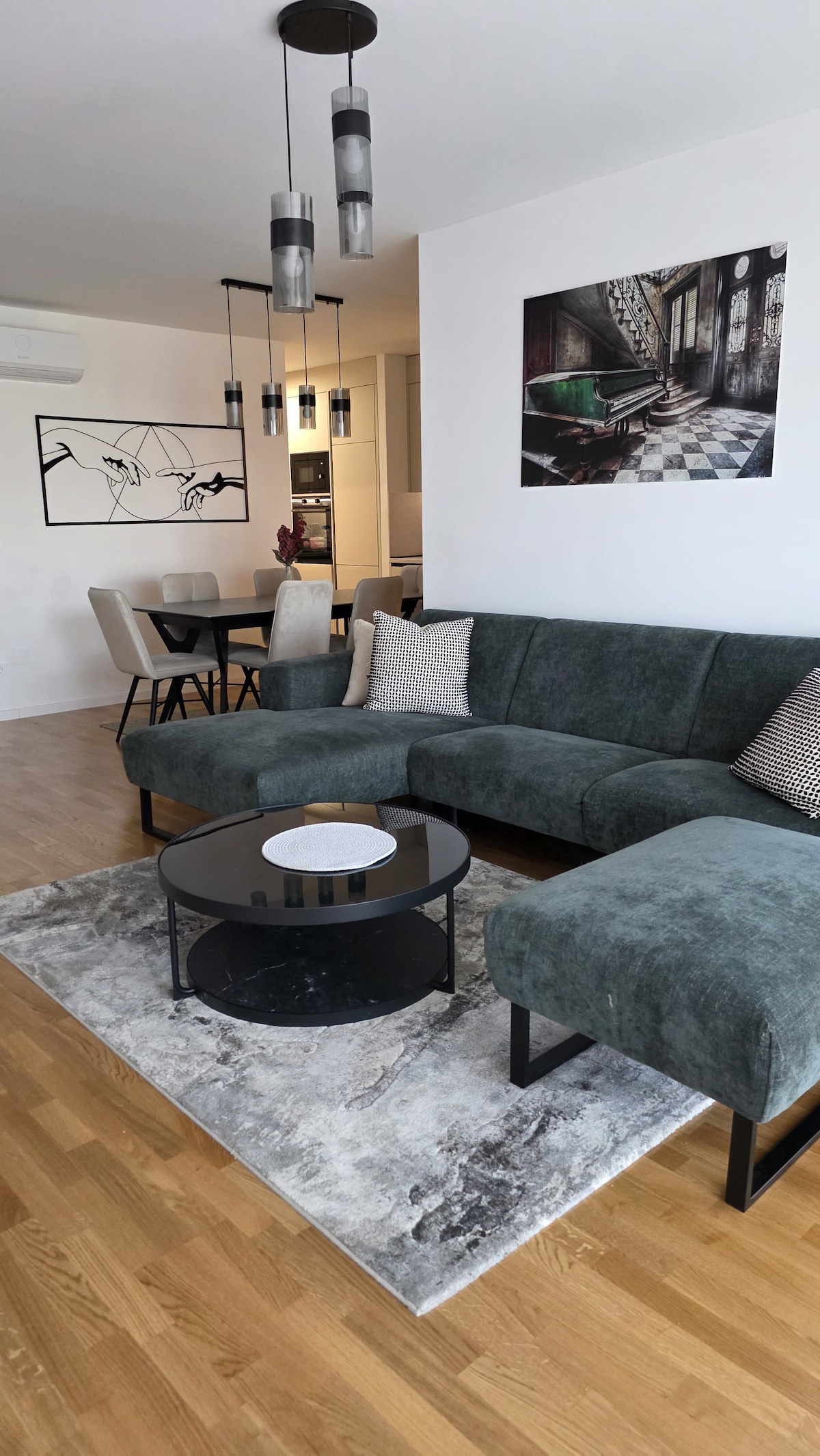 New and modern spacious light apartment on 2 th floor in the near of Zagreb. The apartment consists sharing entrance hallway, living room whit balcony, kitchen with dinning area, sleeping place, and bathroom with terace. Apartment is air conditioned, with central heating, furnished with modern light shades, all kitchen appliances, Smart TV, washer in the bathroom and wireless internet. Distance from Zagreb is about 20 minutes with car to edge of city or 15 minutes whit train to city center.