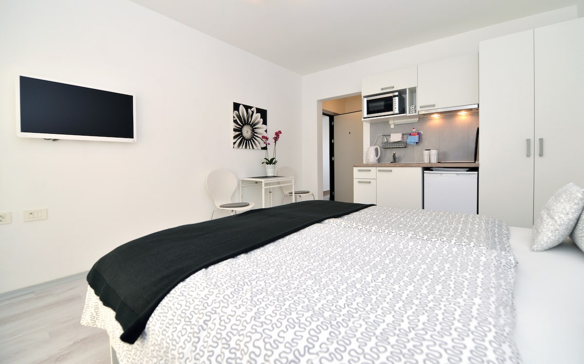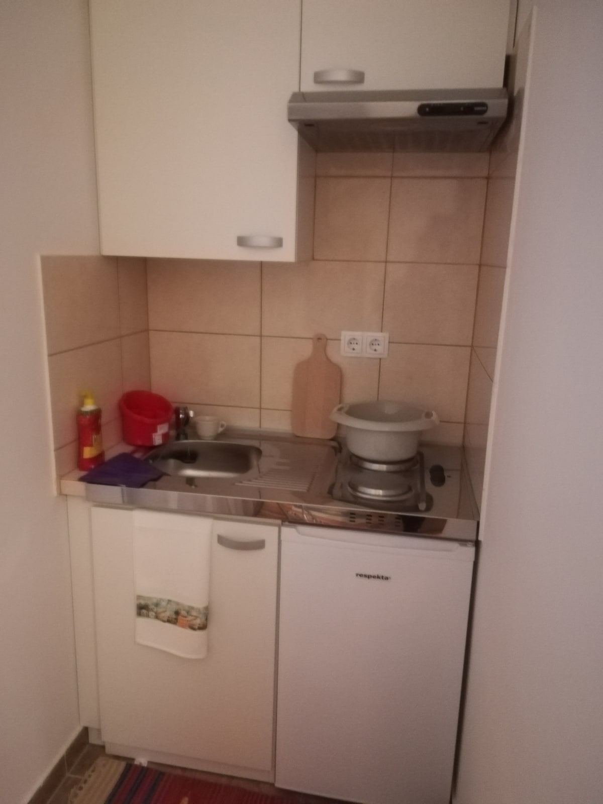 A sweet one bedroom apartment, on the first floor of a small building. The apartment has air conditioning, a kitchen with a dining table for two, a bathroom with a bath tub, and a balcony. Excellent connection to the city. Parking space is included in the price.