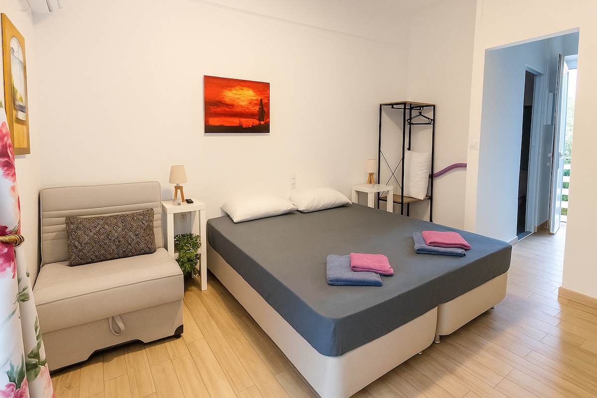 The room features a double bed (180x200 cm), single bed (90X200) and a one-seater sofa bed (85x195 cm) . Enjoy modern amenities such as free Wi-Fi, air conditioning, and a fully equipped kitchen in a space that seamlessly combines elegance and functionality. The sea is just 5 minutes away by car or an 8-minute walk. Please inform us before your departure if you require a receipt or an invoice.