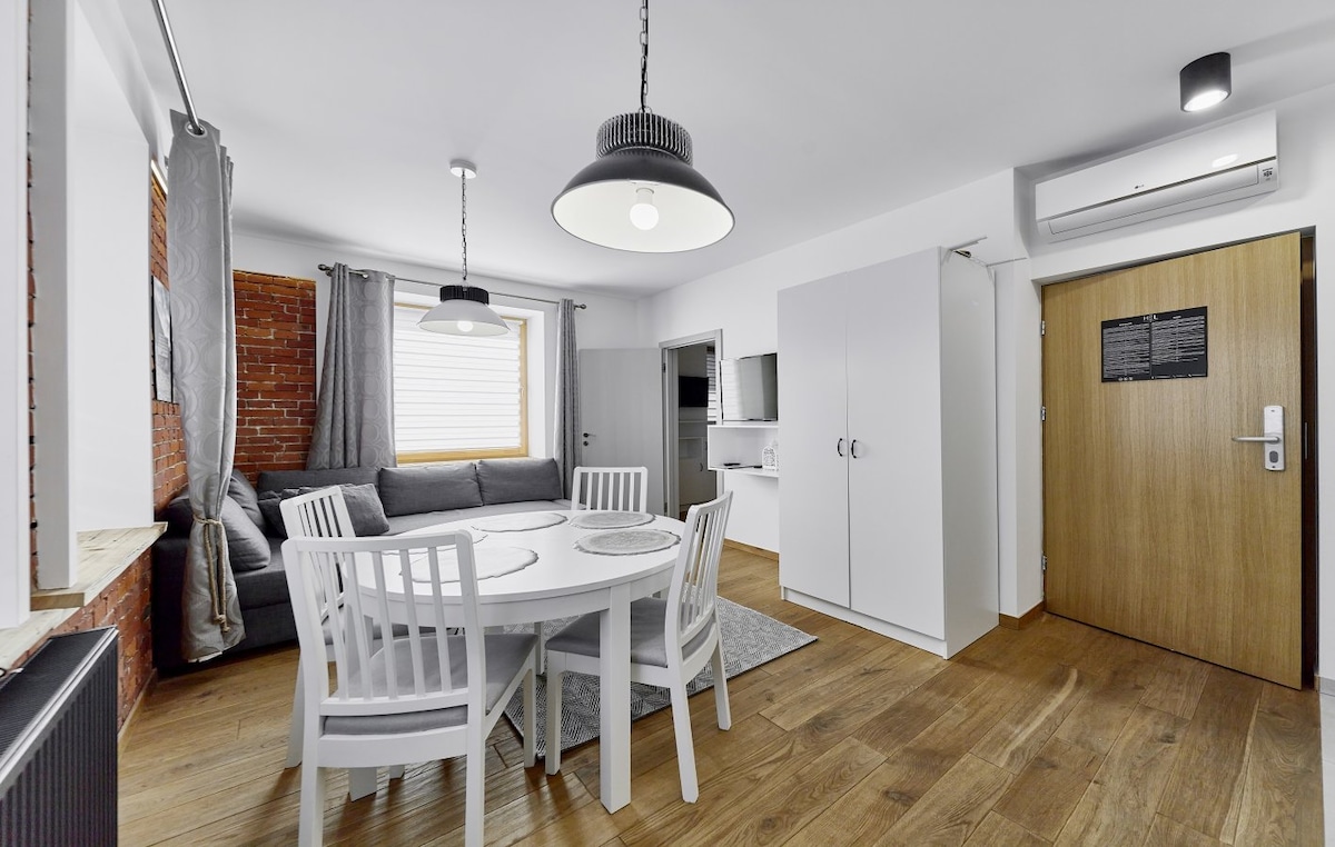 Apartament z jedną sypialnią, w samym centrum miasta Zakopane. Apartament składa się z pokoju dziennego z aneksem kuchennym, sypialnią, łazienką oraz balkonu. Połączenie drewna i klasycznej bieli sprawia że apartament jest niezwykle jasny i przyjemny w codziennym użytkowaniu.