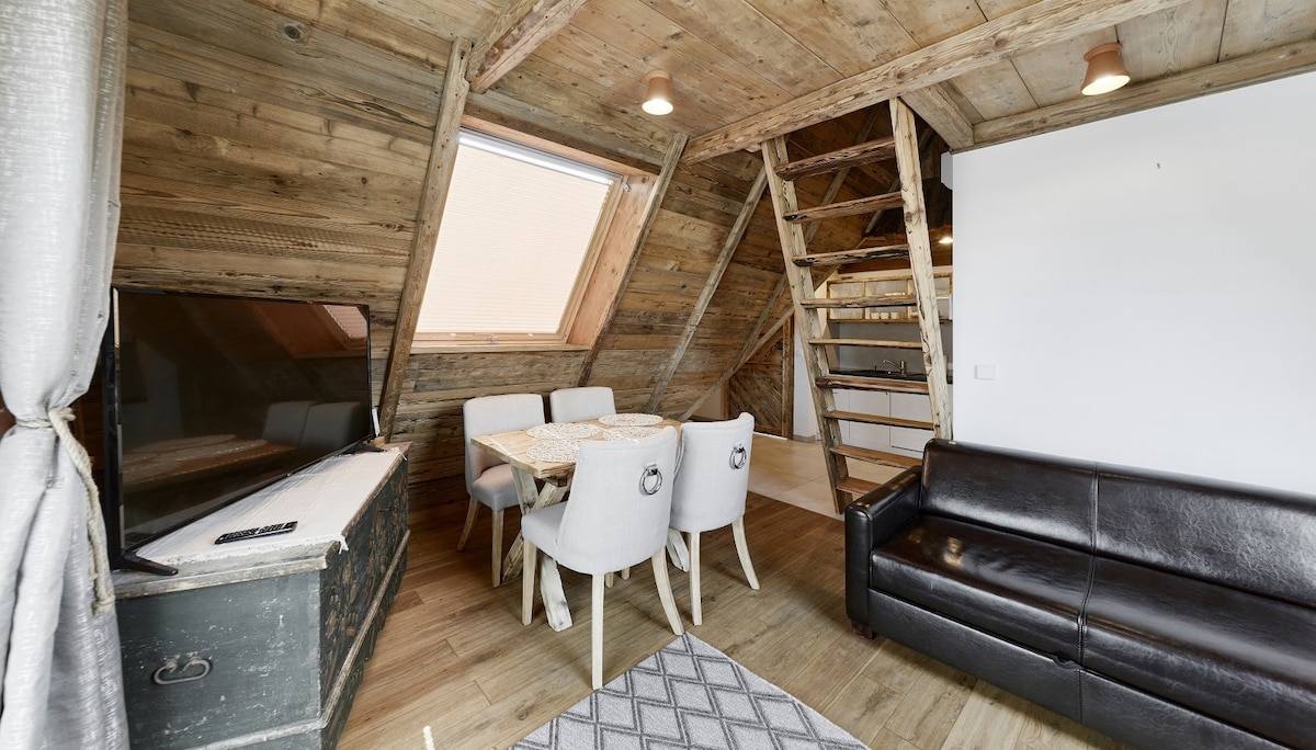 Czteroosobowy lub sześcioosobowy apartament z jedną sypialnią, w samym centrum miasta Zakopane. Apartament składa się z antresoli oraz pokoju dziennego z aneksem kuchennym, sypialnią, łazienką oraz balkonu. Wykończenie w drewnie sprawia, że apartament jest niezwykle stylowy i przyjemny w codziennym użytkowaniu. W przestronnym pokoju znajduje się w pełni wyposażony aneks kuchenny.
