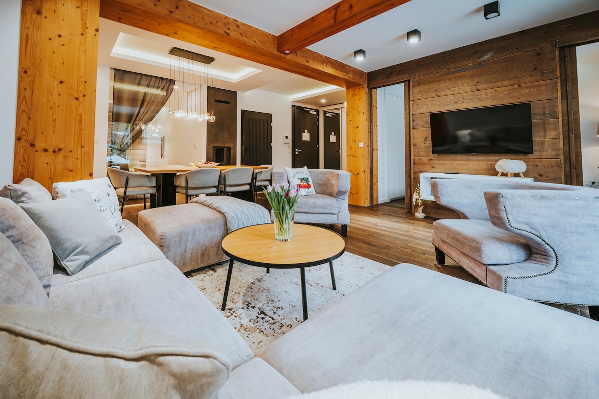 Grand Chalet to luksusowa willa o powierzchni 250 m2 w sercu Podhala z panoramicznym widokiem na Tatry. Na gości czekają: 4 klimatyzowane sypialnie, 4 łazienki, jacuzzi z widokiem, sauna, sala gier z bilardem i PS5, strefa fitness, gabinet do pracy ze światłowodem, kącik dla dzieci, kominek i całoroczny grill. Willa oferuje komfortowe zakwaterowanie dla 10 osób. Idealne miejsce na rodzinny wypoczynek, spotkania z przyjaciółmi czy workation – komfort, nowoczesność i wyjątkowy klimat w jednym.