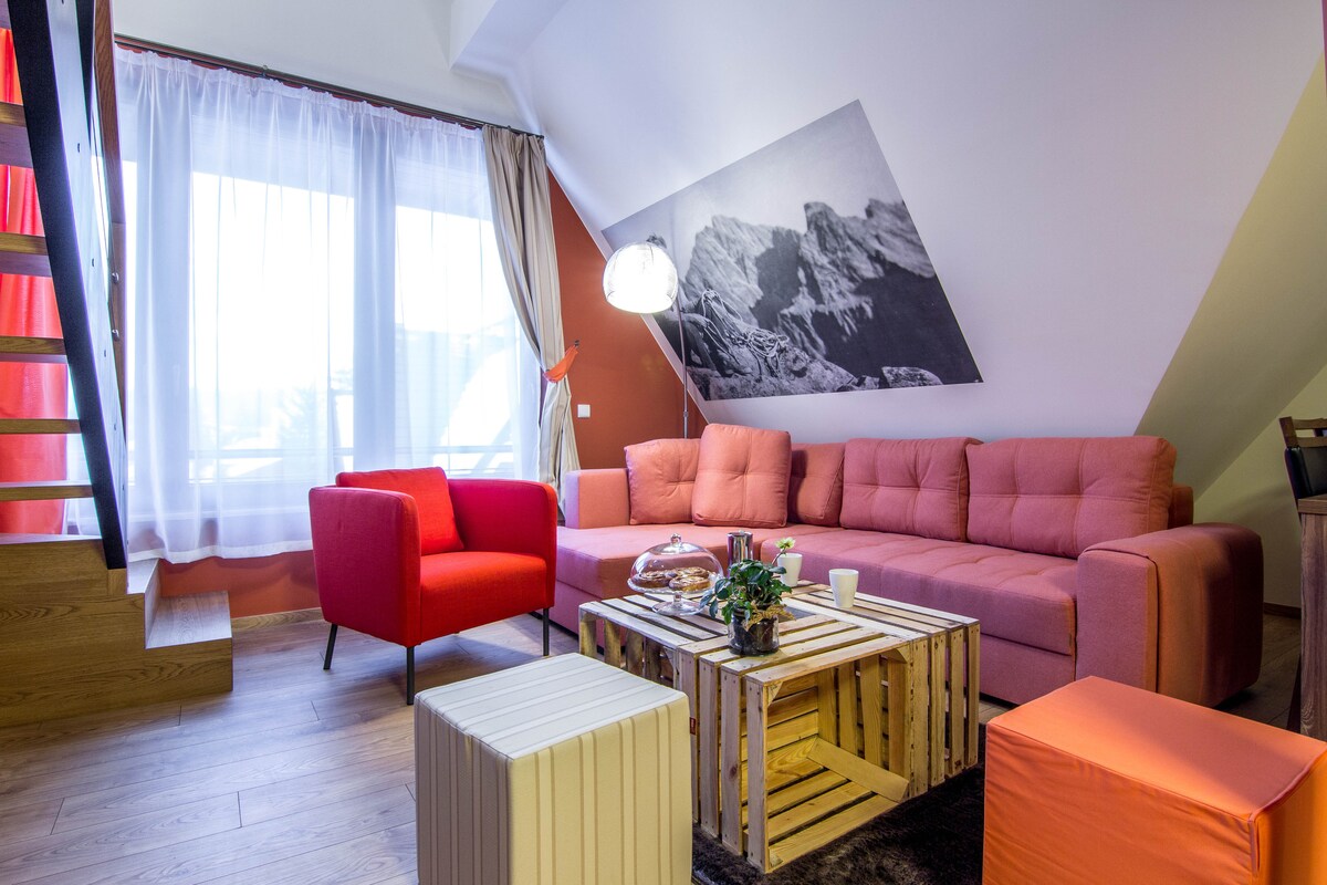 Kick back and relax in this calm, stylish place. Sit at a veranda and take a deep breath with a cup of fresh coffee made in the apartment. Listen to birds, contemplate the view of the entire Tatra Mountains panorama. Or lie on a wooden floor directly at a fire place. In winter you may reach ski slopes already on your skis; in summer walking and hiking trails start in the forest just behind the apartment.