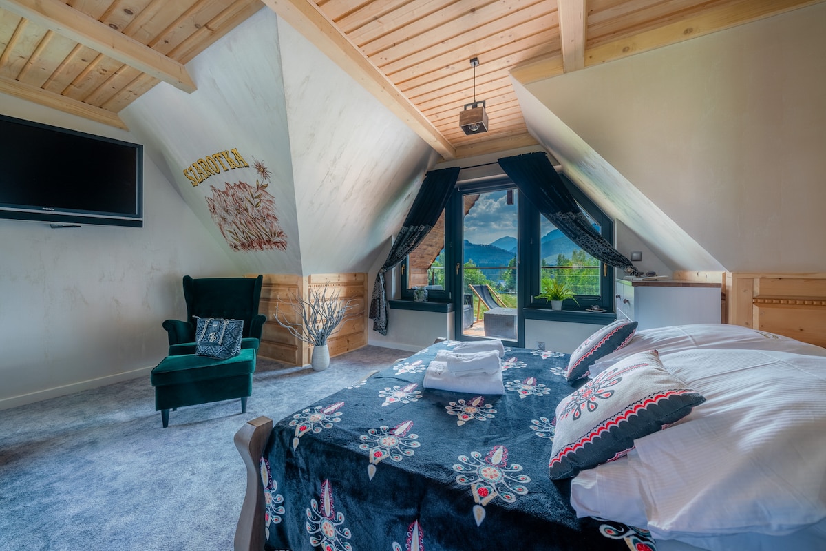 Apartament Golden View to luksusowy apartament zlokalizowany na drugim piętrze prestiżowego apartamentowca Polana Szymaszkowa Ski Resort, o powierzchni 28 m2. Jednym z największych atutów apartamentu jest jego lokalizacja. Obiekt położony jest zaledwie 50 m od stacji narciarskiej Polana Szymaszkowa oraz basenu termalnego z pięknymi widokami na całą panoramę Tatr wraz z Giewontem na pierwszym planie. Zaprojektowany został dla dwóch osób w nowoczesnym stylu.