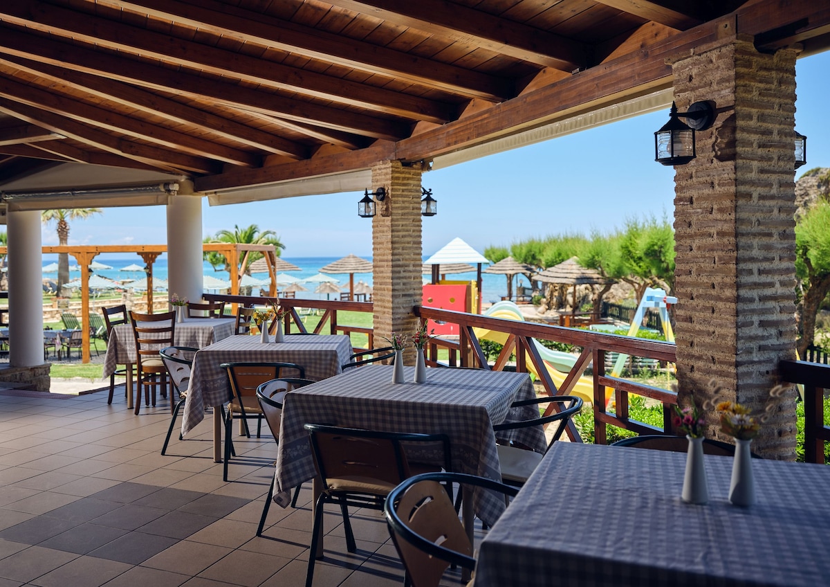 Unveil the spacious comfort of our Suite with Sea View, which is located on the 1st floor and spans an ample 60 square meters. Inside, you`ll find an open-plan area thoughtfully furnished with 1 double bed and 2 single sofa beds, ensuring plenty of room for relaxation. Entertainment is made easy with the 50`` Smart TV, while the provided air conditioning ensures a pleasant atmosphere throughout your stay. Come and enjoy the perfect blend of comfort, a simple yet luxurious outdoor retreat.