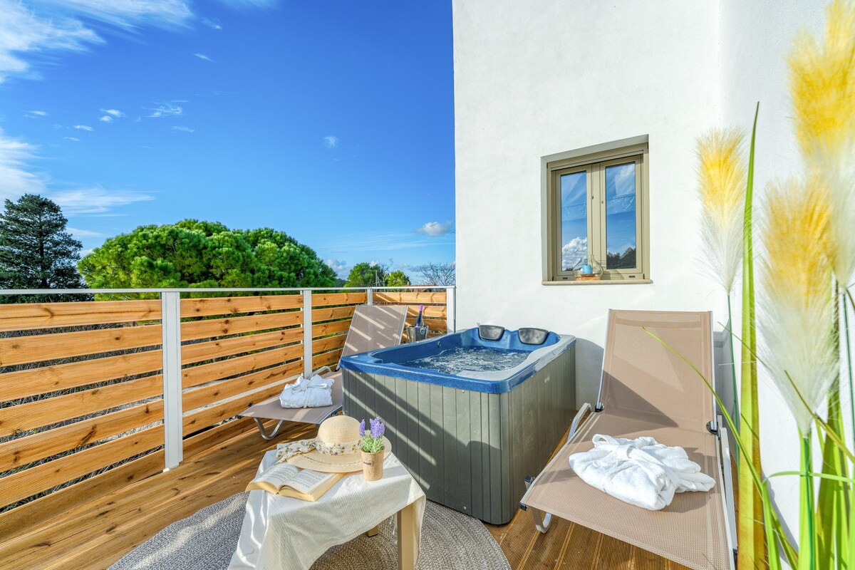 A charming little hideaway where you can enjoy the view from a top the olive trees .A really different and exciting choice for guests who enjoy the look and feel of naturally toned wood , earthy hues and a view to revive the soul.Experience pure bliss at our spa's breathtaking outdoor jacuzzi Surrounded by serene nature, immerse yourself in relaxation as the warm, bubbling waters melt away tension and rejuvenate your spirit..