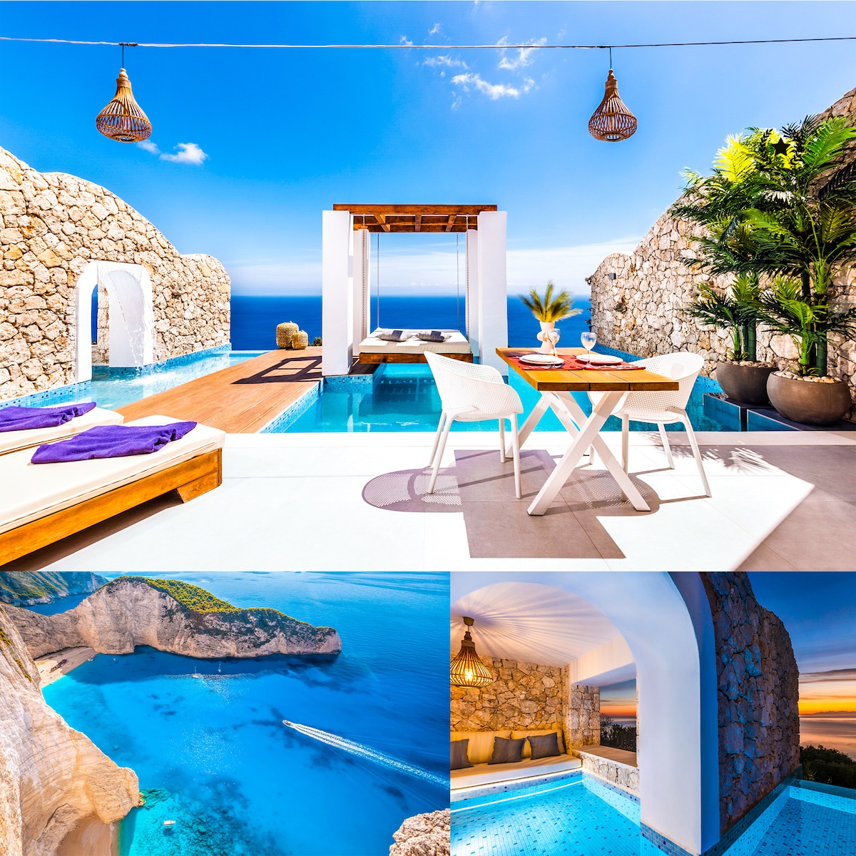 In the heart of the famous rocky beach of Porto Limnionas at Zakynthos island, LCV complex (License No: 1235974) consist of 3 luxurious cave villas in perfect harmony with the surrounding natural environment, nested into the cliff, bathed in sunlight by day and painted with amethyst purple in the sunset. Each villa has its own private infinity pool, is fully equipped and enjoys a majestic view of the sea and the surrounding area.