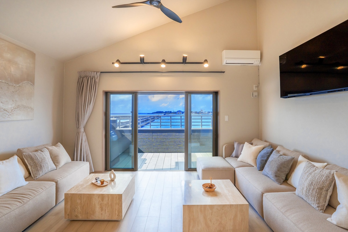 340度オーシャンビューの崖の上に立つ2022年9月新築の一軒家。 約100平米のすべての部屋がオーシャンビュー。お客様の使用可能エリアは2階の宿泊施設と、3階屋上のバーベキューテラスです。 各部屋に50インチ以上のテレビ、リビングには4Kプロジェクターと大型のスクリーンがあり、映画鑑賞も可能です。 外階段からつながる屋上にはバーベキューテラスがあり、サンライズも、日中のオーシャンビューも、夕方のサンライズも、夜の夜景と星空、月も楽しめます。海や自然の景色に癒されます。 屋上テラスにはトイレが完備されており、キッチンスペース、洗い場もございます。コンセントは8つ有り、IHを使った調理なども可能です。 2つある寝室には、ダブルベッドが2つずつ用意されており、最大8名様の宿泊が可能。 リビングにあるソファーにもシングルベッドサイズのスペース有り。 カップルでも、ご夫婦でも、ご家族でも、3世代のご旅行でもお勧めです。 周りはとても静かで、夜は虫の音色、フクロウの声、耳を澄ませば波の音なども聞こえてきます。 車で10分の場所に海中道路などがあり、マリンスポーツの拠点としてもお勧めです。