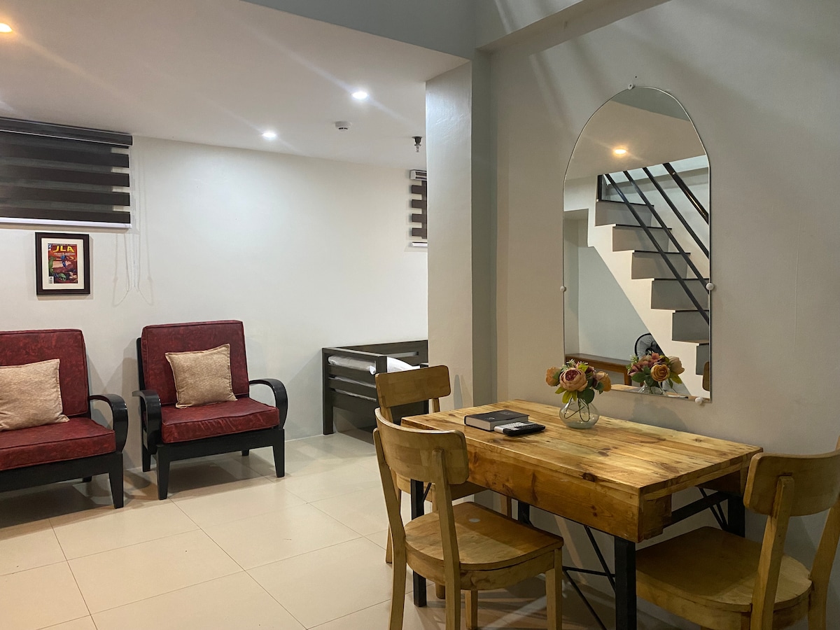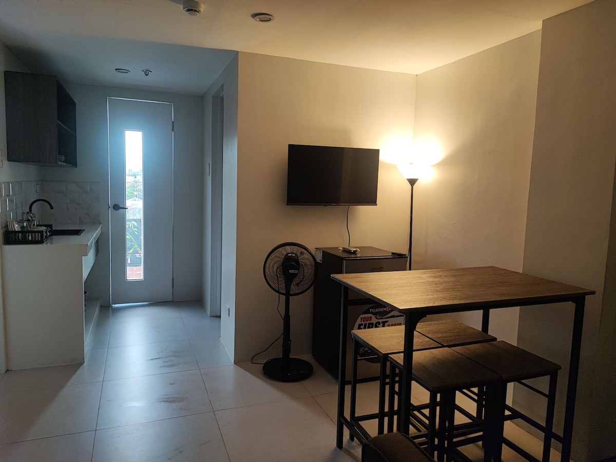 Studio type Good for 2 pax 54"x 75" chiropractic bed Wifi Smart tv Terrace Airconditioned room Bathroom shower heater Shampoo and body wash *Parking is on a first come, first served basis. Not guaranteed *free use of water dispenser and microwave *1 set of cooking materials with charge