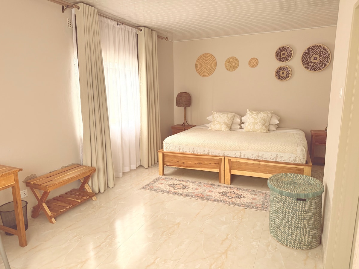 Comfortable en-suite bedroom in a boho-styled home, with flexible super king or twin beds, a premium mattress, study desk, and in-room ironing facilities. Guests enjoy access to a shared lounge, kitchen, and garden. Located in secure Meanwood Ndeke, just 15 minutes from Kenneth Kaunda International Airport (KKIA), ideal for both short and extended stays.