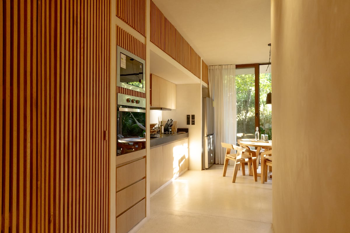 Casa Kokí is one of the only villas in Tulum with a heated private pool. Located in La Veleta, 20 min from the beach, our designer hideaway blends modern comfort with a local, bohemian vibe. Enjoy 100 Mbps Wi-Fi for work or streaming, then explore nearby cafés, bakeries, and bars. Roads here are unpaved and bumpy — part of the off-the-beaten-path charm — but you’ll return to a private, peaceful retreat where warm water, soft lighting, and jungle sounds set the mood for total relaxation.