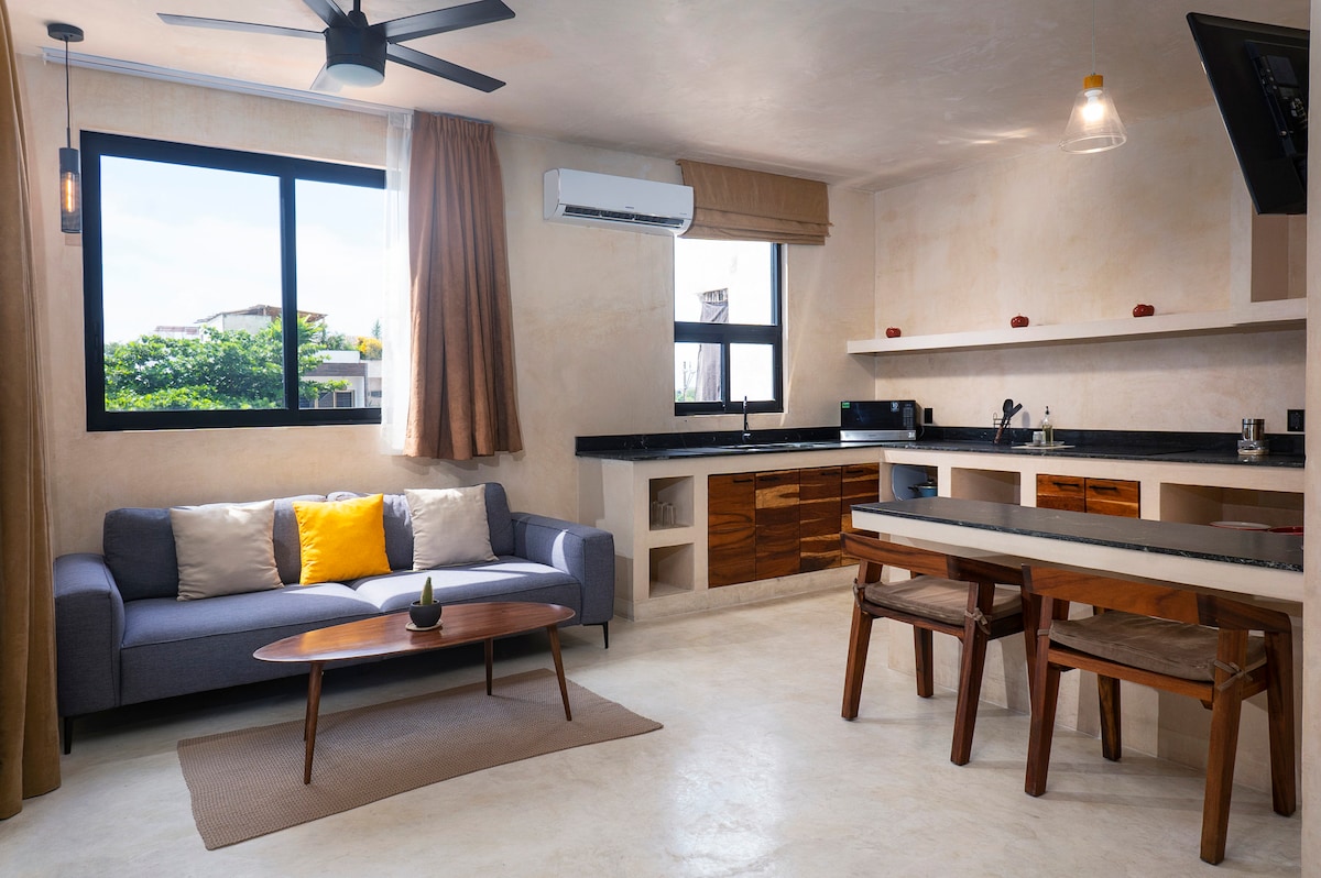 Explore the jungle and the caribbean sea of Tulum from our UJO complex is located in the center of Tulum, close to everything and just 5 minutes by car from the beach. Enjoy this paradise! The apartment has a terrace and hammock to relax 1 bedroom with a king-size bed and closet, a living room with a sofa-bed and TV, a fully equipped kitchen with coffe maker, fridge and everything you need to cook, eating bar and a full bathroom.
