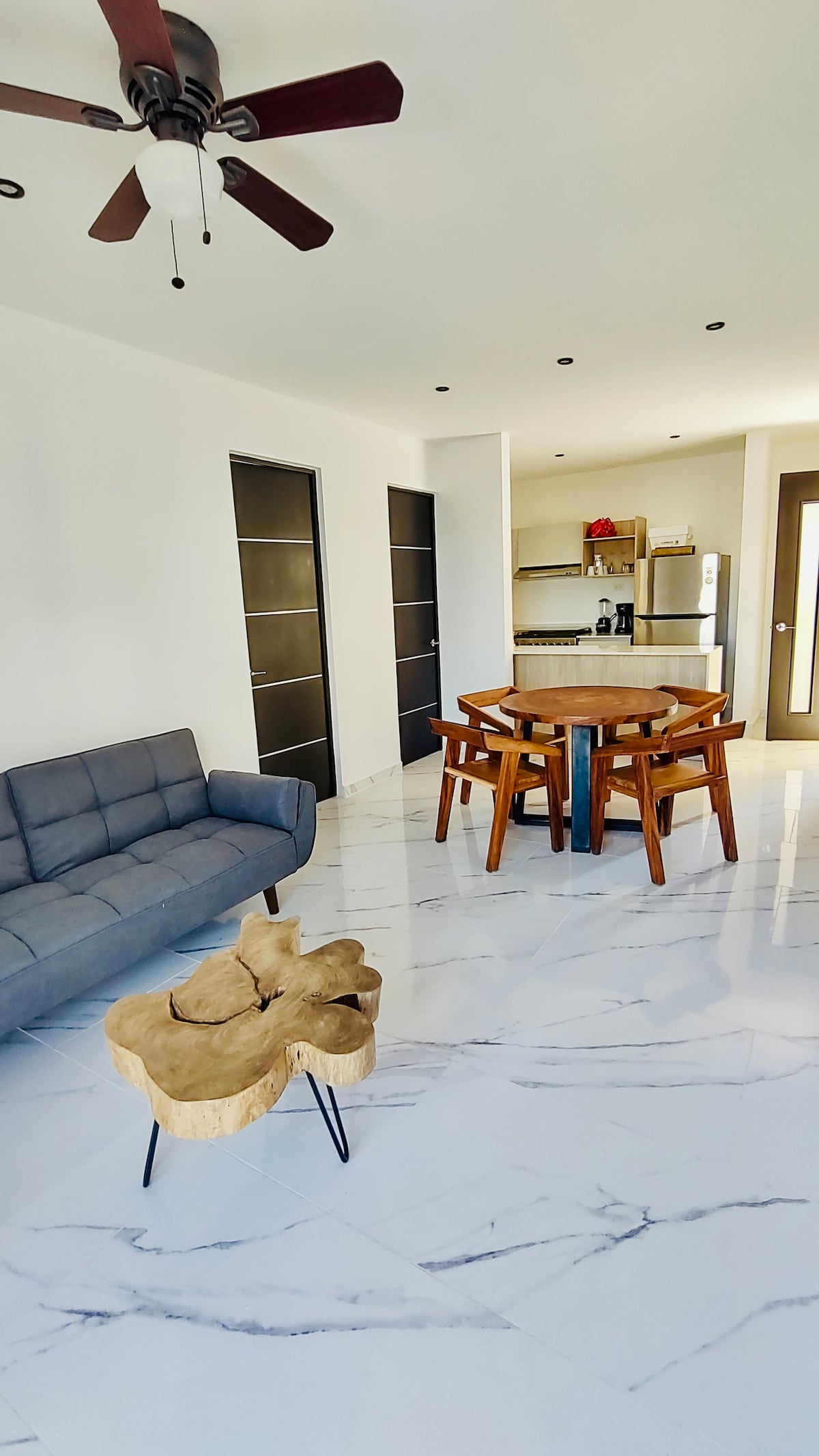 Come with your family to this beautiful apartment, located on the jungle side, 15 minutes from TULUM beach and 10 minutes driving from downtown. The complex has 2 swimming pools, cenote, gym, yoga area, pet area. The apartment and the complex are ideal for resting, quiet and with a lot of interaction with nature. The adventure begins before you arrive, since you must pass about 300 meters of amazing dirt road . (Unpaved)
