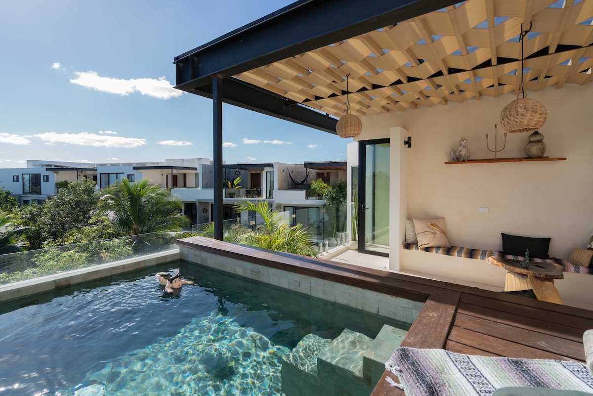 Toma un baño en la piscina privada de este encantador departamento en Tulum