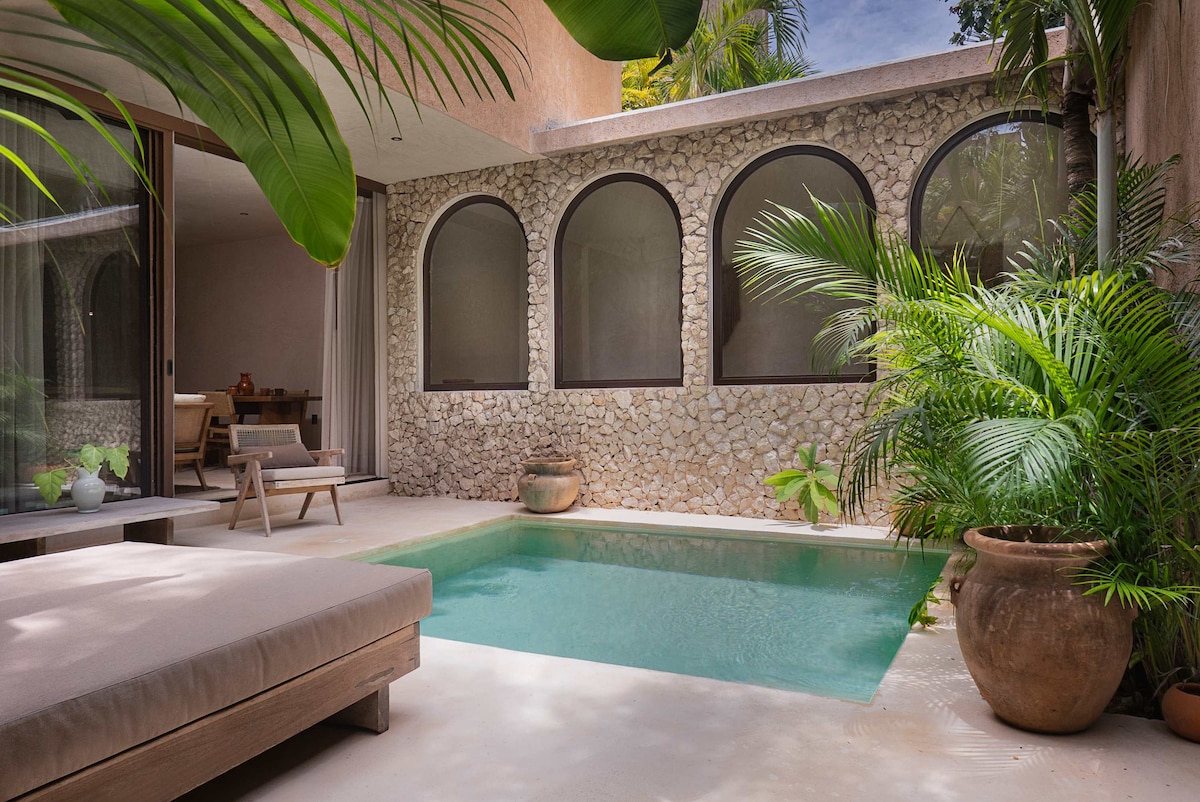 Jungle Oasis Loft w/ Private Plunge Pool & Terrace! Escape to this stylish 2nd-floor loft with a private terrace & plunge pool overlooking lush jungle views! Enjoy free bikes during your stay, a fully equipped kitchenette, and 24/7 security for peace of mind. Designed for couples, solo travelers & digital nomads, this modern retreat is cozy,quiet,and surrounded by nature just 15 min from the beach & downtown! Relax in your kingsize bed, dip in your pool,or explore nearby cenotes,beaches & more!