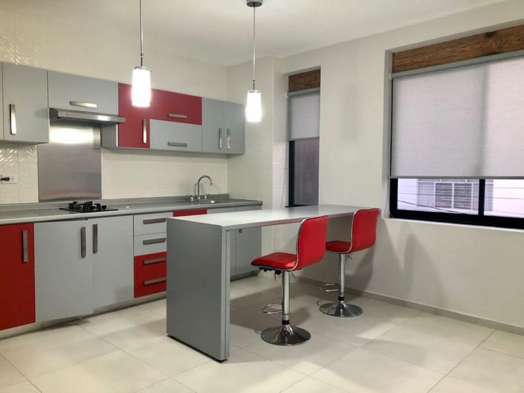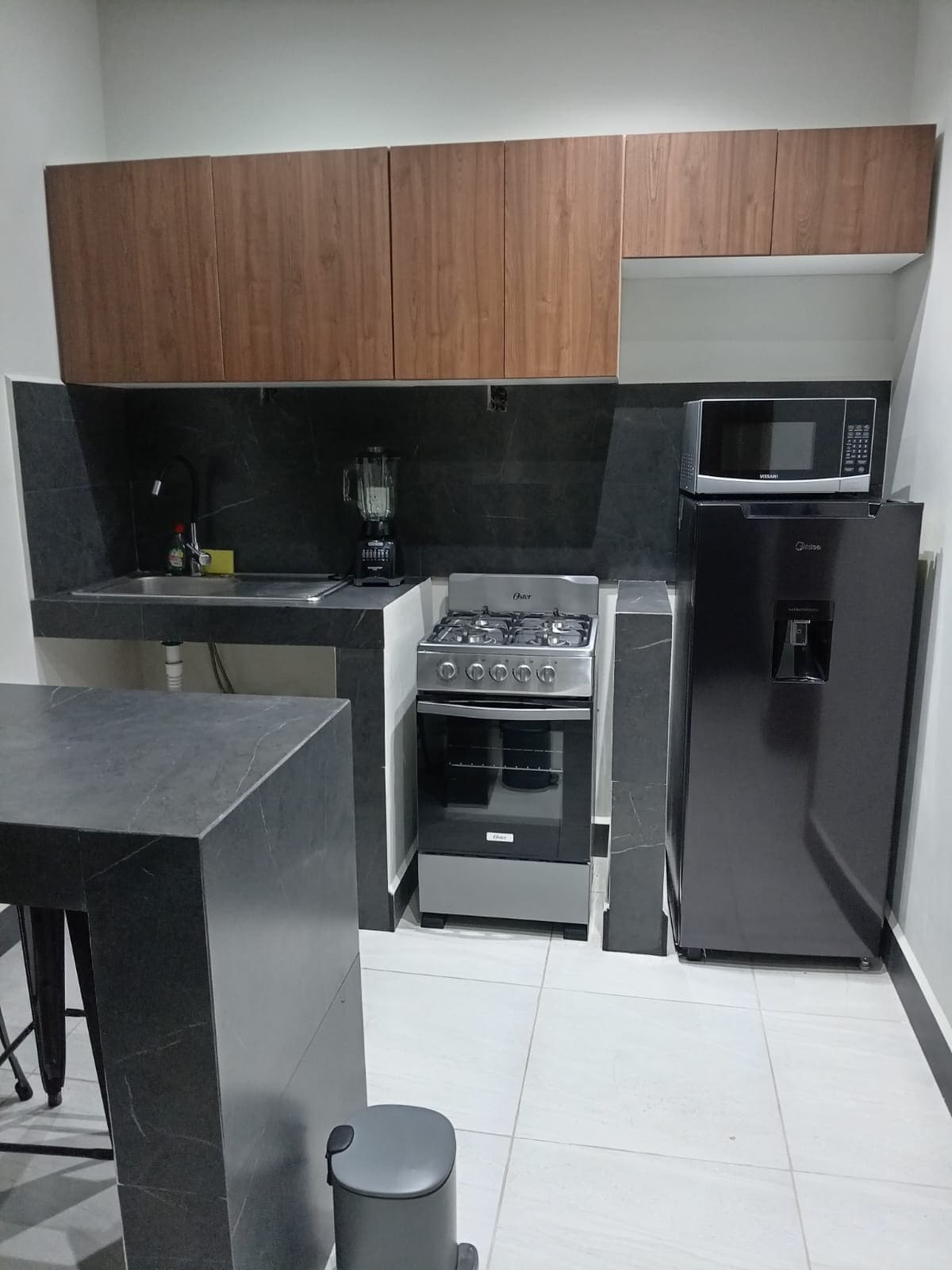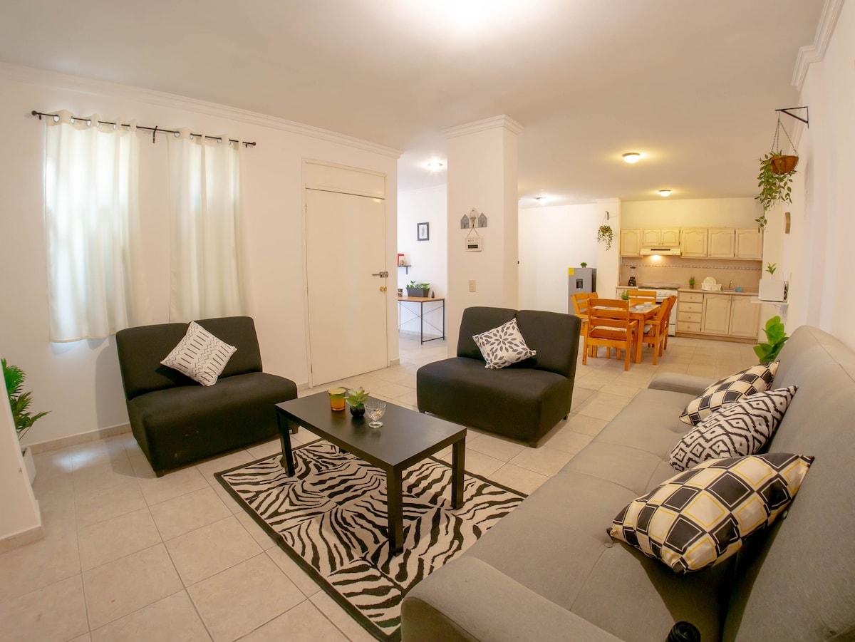 Newly remodeled, modern apartment with a fully equipped kitchen, living room, and new beds. It has a shared garage with space for one car. It's 5 blocks (10-minute walk) from the bus station and a 15-minute walk to Jardín de San Marcos, the center of the San Marcos National Fair! The apartment is on the second floor on Aguascalientes' main avenue. On the same street, you can find convenience stores, a bus/taxi stop, and home-style and fast-food restaurants.