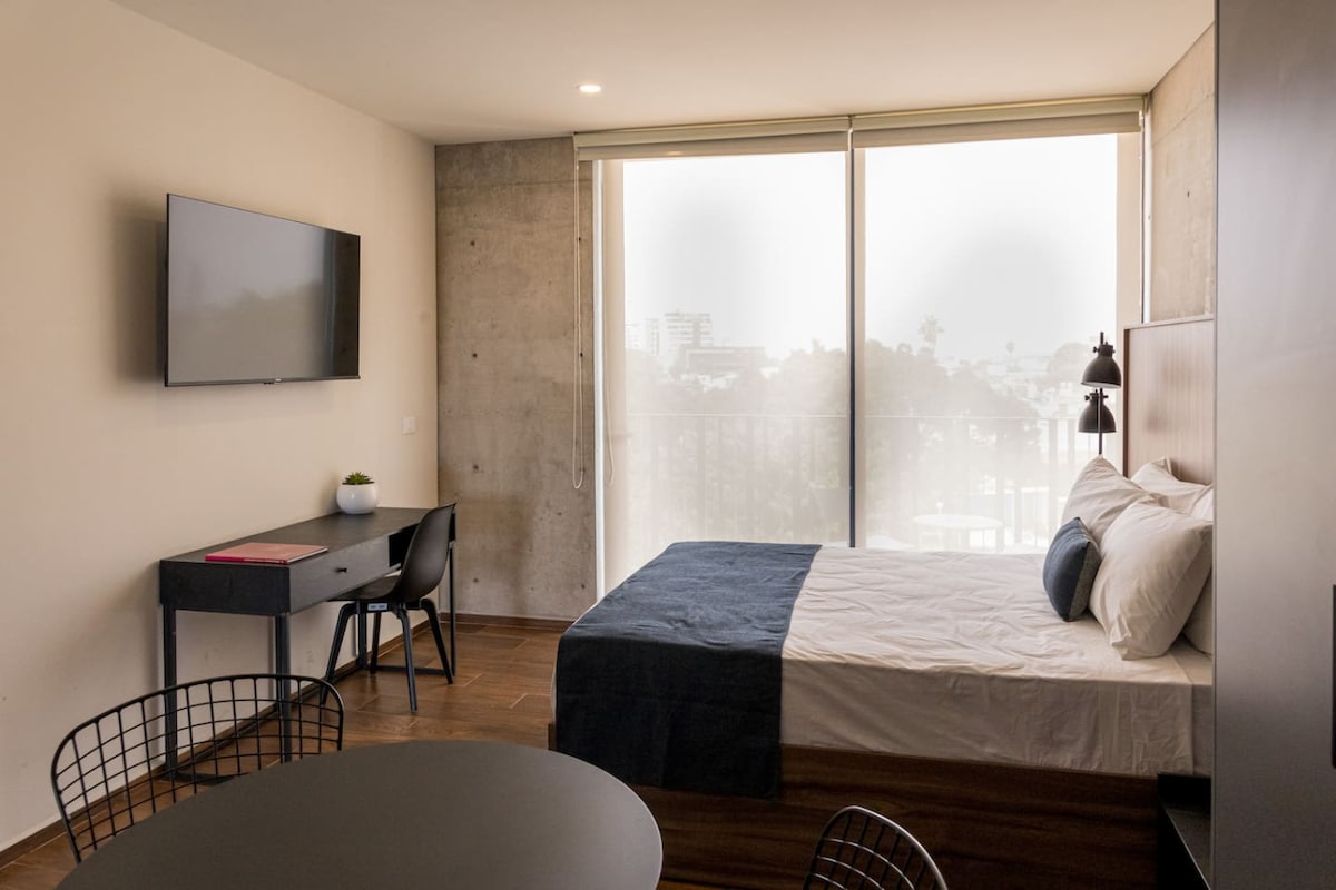 Departamento nuevo con excelente iluminación, confortable y cálido. Este lugar te encantará ya que cuenta con una hermosa vista de la ciudad de Guadalajara, además la torre cuenta con espacios para el descanso y la recreación (alberca, gimnasio, rooftop). Su ubicación frente a una estación del tren ligero facilita la movilidad. El primer cuadro de la ciudad a 20 minutos en auto, un chedraui justo en frente y una pequeña plaza a un costado con variedad de servicios.