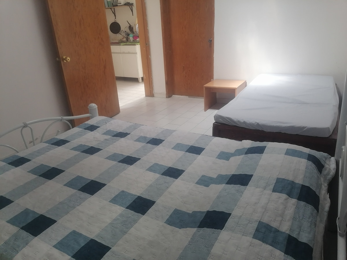 Una habitación con una cama matrimonial y un sofá cama individual, donde compartirás las áreas comunes con otros huéspedes. Ubicado a 5-6min caminando de la plaza principal de Calvillo y 2 minutos de la calle de las graditas!