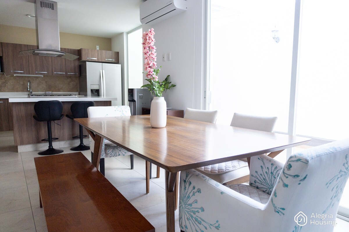 Alojamiento ideal y único para descansar dentro de zona residencial con vigilancia las 24 horas y acceso controlado, lo que permite hospedarse en un lugar seguro con excelente ubicación. Es una casa nueva, amplia, moderna y funcional, cuenta con aire acondicionado y todo lo necesario para que su estadía sea única.