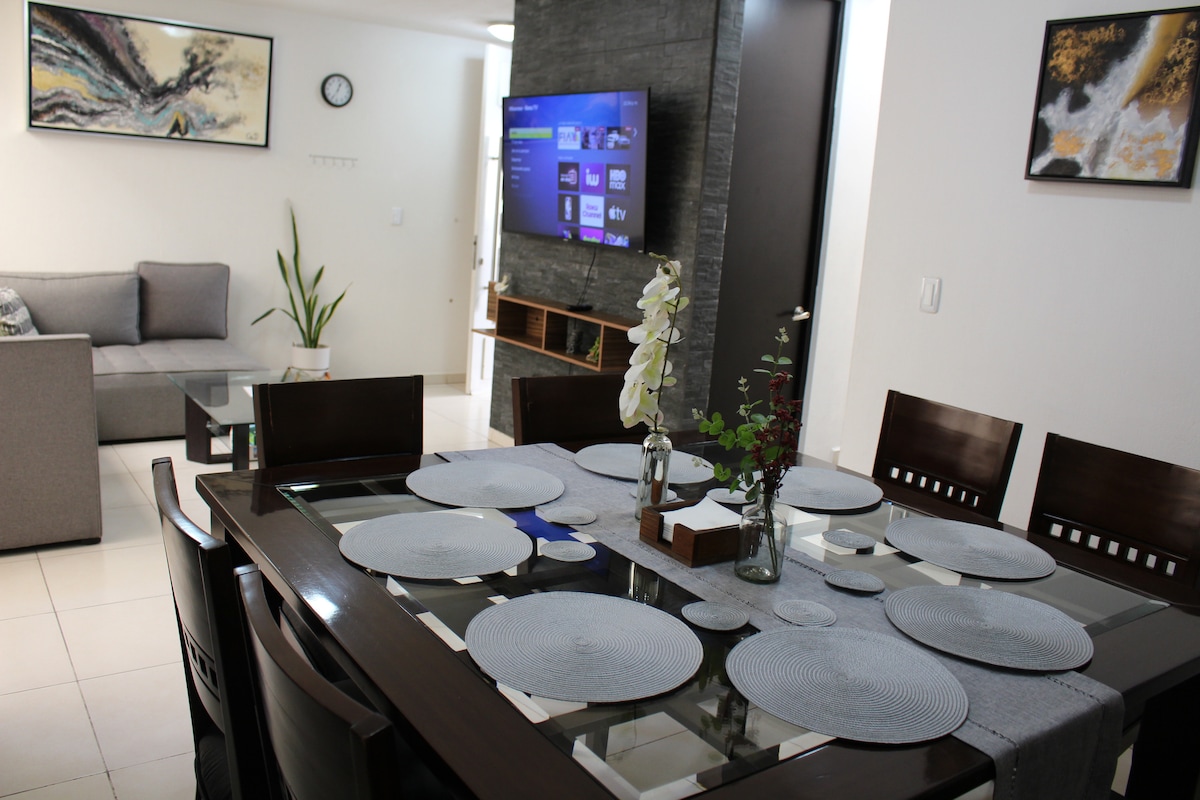 TU COMODIDAD ES NUESTRA PRIORIDAD, con excelente ubicación al poniente de la Cd, una planta, cochera para un auto, 2 habitaciones con baño propio cada una, estancia con dos sofá-cama matrimonial, baño de tocador, acogedora terraza, doble altura en sala comedor, servicio de Internet, con rápidos accesos, concepto familiar en zona segura, cerca del centro, muy limpia, lavadora y secad Para negocios cuenta con todas las comodidades para trabajar en un ambiente agradable y ejecutivo.