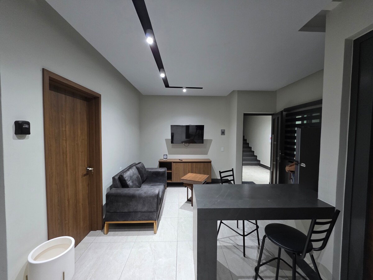 Bonito departamento con terraza en segunda planta con una cama King size, un sofá-cama y un sofá. Contamos con pantalla S-Mart TV para que puedas acceder a tus plataformas preferidas. El departamento se encuentra cerca de las avenidas principales de la ciudad, por lo que facilita el acceso al centro histórico, así como la movilidad al sur de la ciudad. Cuenta con cochera techada y portón eléctrico. Hay todo tipo de comercios a menos de 5 minutos caminando. ***Facturamos tu estancia***
