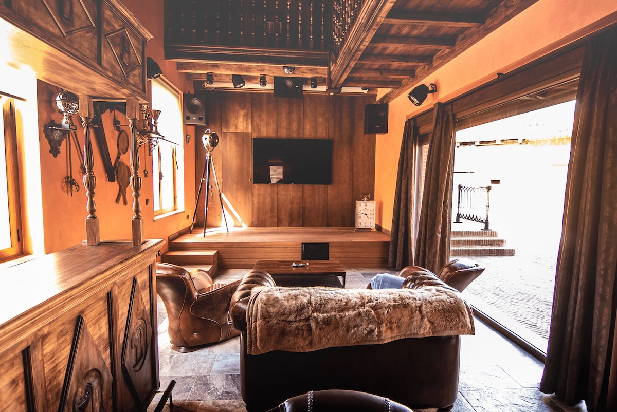 Revive la sensación y temática hispano-americana en plena naturaleza española. Disfrutaras de una habitación con una amplia camas matrimonial y un baño completo. Dispondrás de un amplio salón-comedor con chimenea y pantalla grande de televisión, así como de una biblioteca y un patio exterior acogedor en el que podrás disfrutar de la naturaleza. *Novedad - Piscina cubierta, sauna y gimnasio