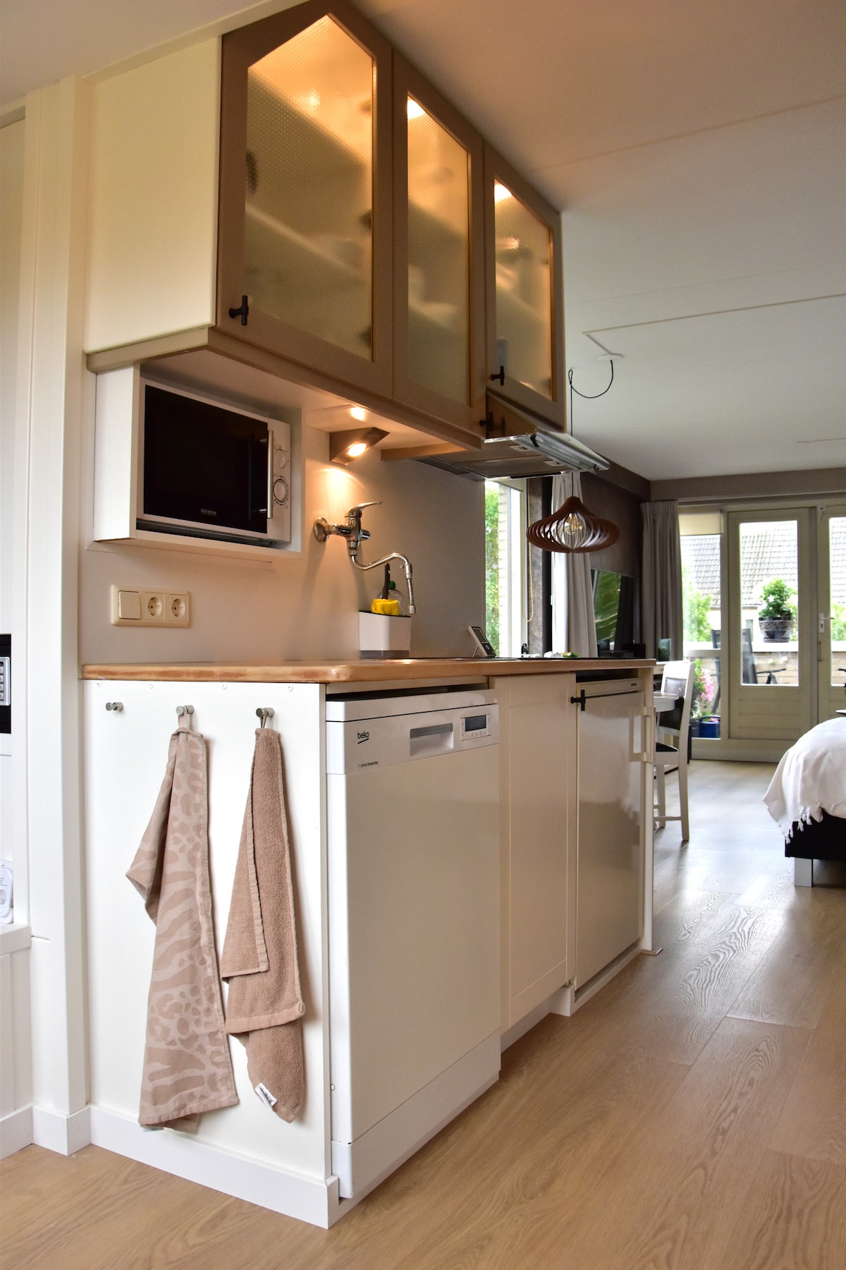 Cosi private boutique room with bedroom and kitchen island close to the sea, centre and train station. Floor heating system and kitchen with induction plate, refridgerator and combi microwave. Bathroom with walk in rain shower. Only 500 meters from the sea and 50 meters to Restaurant and shop. A private patio is available for outside breakfast/diner. The garden can be closed off and the Jacuzzi (39°C) and Sauna can be booked for a part of the day.