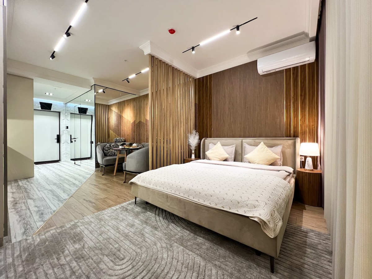 Насладитесь стильным отдыхом в центре Ташкента — в апартаментах с видом на Tashkent City. Рядом Tashkent City park, Magic City, огромный выбор ресторанов. В спальне кондиционер. King-size кровать, дизайнерский интерьер, полностью оборудованная кухня, кофемашина, кондиционер и балкон с видом на Tashkent City. В доме: ресепшен, коворкинг, фитнес-зал, смотровая площадка. Идеально для деловых поездок и романтических выходных. Высокоскоростной Wi-Fi в апартаментах и коворкинге.